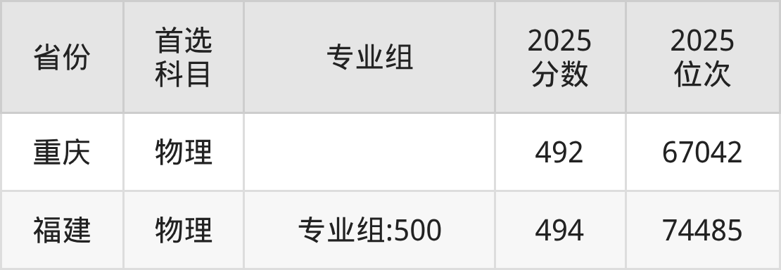 物理类最低分对应地区为重庆,录取位次为67042,超本科线67分;最高分对应地区为福建(专业组:500),录取位次为74485,超本科线53分。