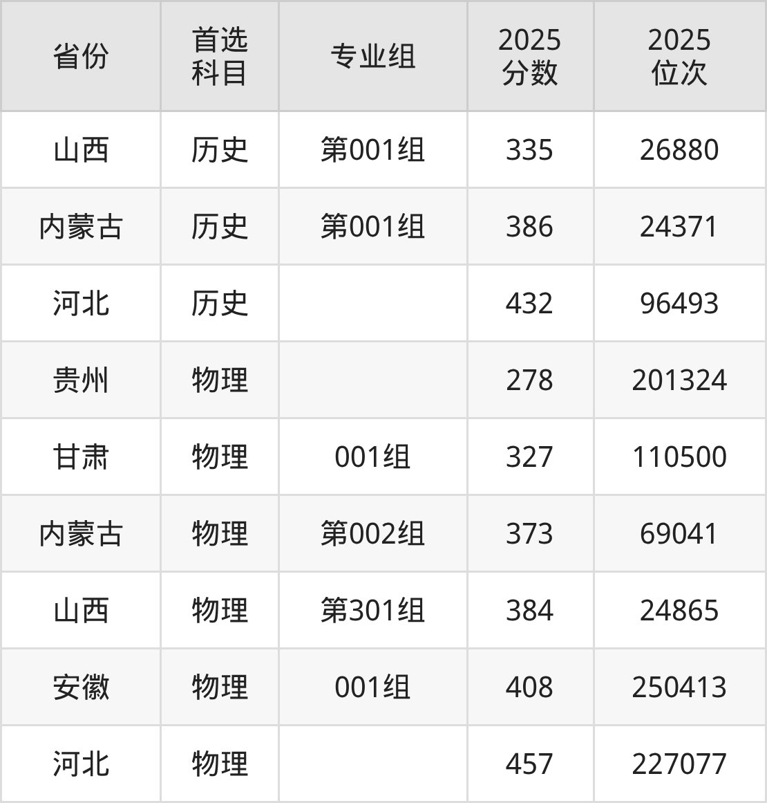 历史类最低分对应地区为山西(第001组),录取位次为26880,超专科线235分;最高分对应地区为河北,录取位次为96493,超专科线232分。