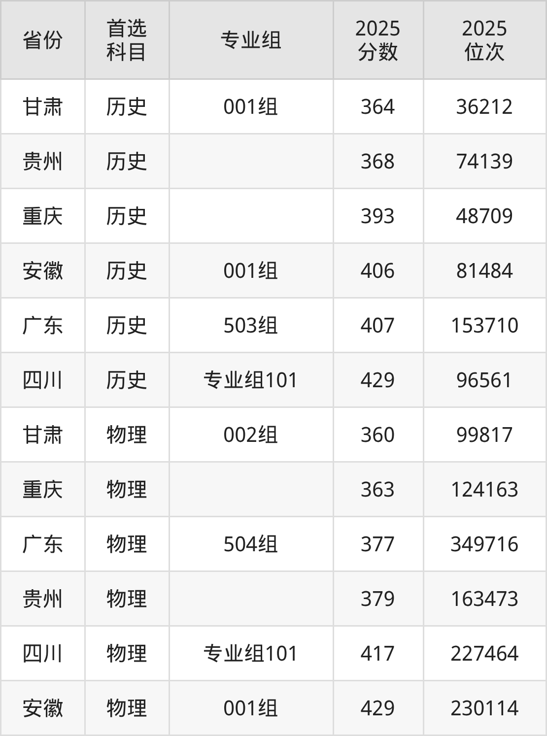 历史类最低分对应地区为甘肃(001组),录取位次为36212,超专科线204分;最高分对应地区为四川(专业组101),录取位次为96561,超专科线279分。