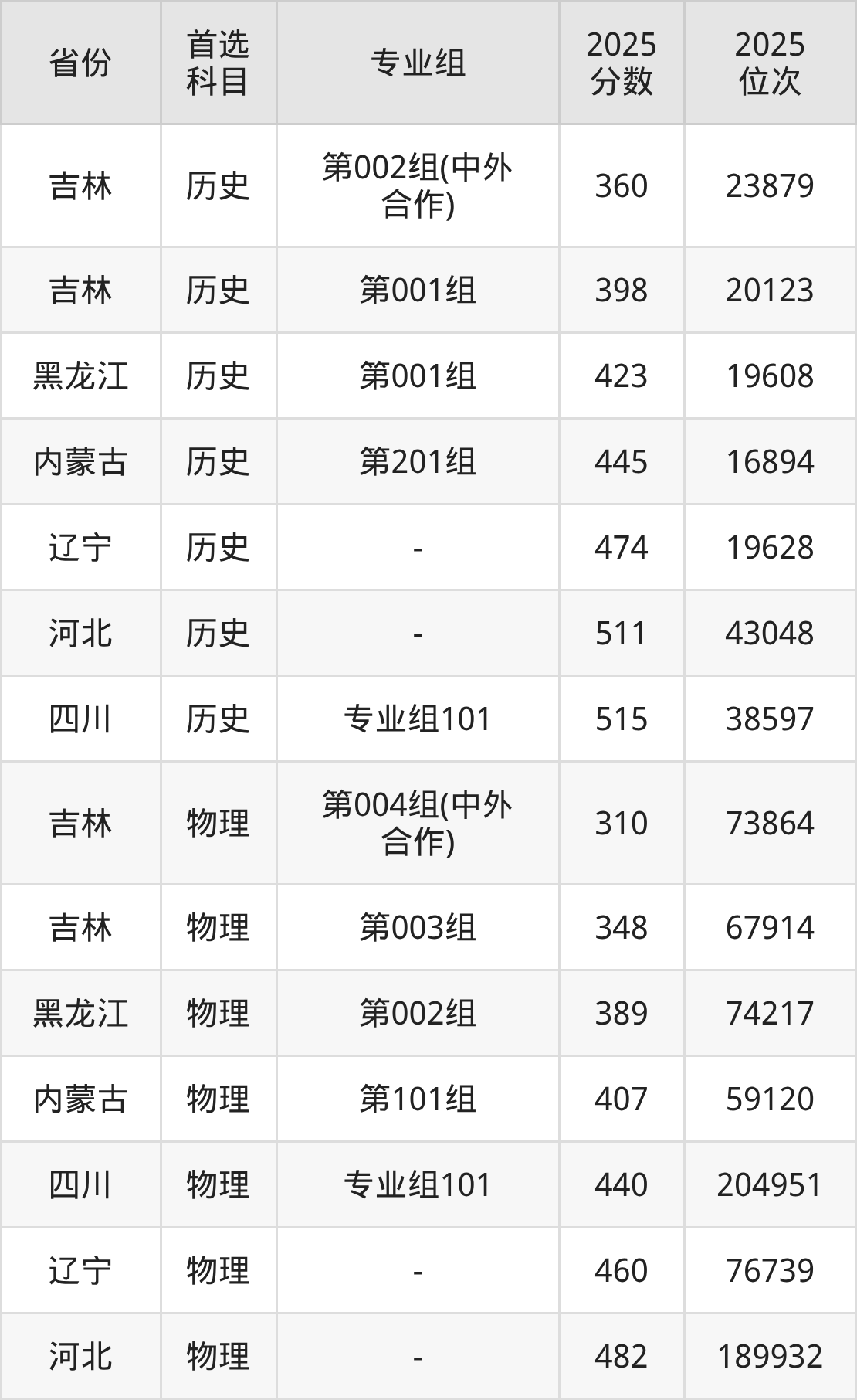 物理类最低分对应地区为吉林(第004组(中外合作)),录取位次为73864;最高分对应地区为河北,录取位次为189932,超专科线282分。