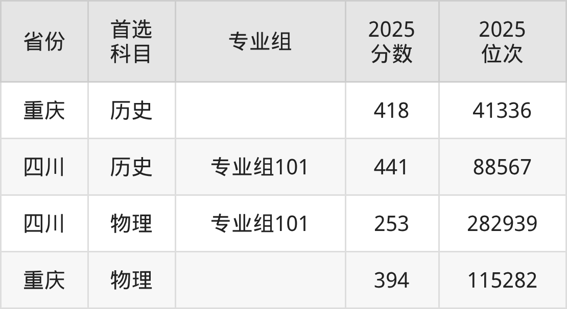 历史类最低分对应地区为重庆,录取位次为41336,超专科线238分;最高分对应地区为四川(专业组101),录取位次为88567,超专科线291分。