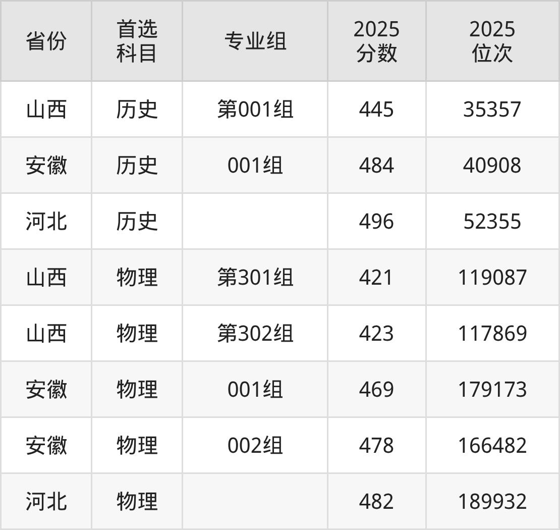 历史类最低分对应地区为山西(第001组),录取位次为35357,超本科线2分;最高分对应地区为河北,录取位次为52355,超本科线19分。