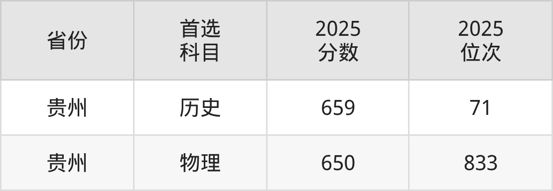 历史类最低分对应地区为贵州,录取位次为71,超本科线201分。