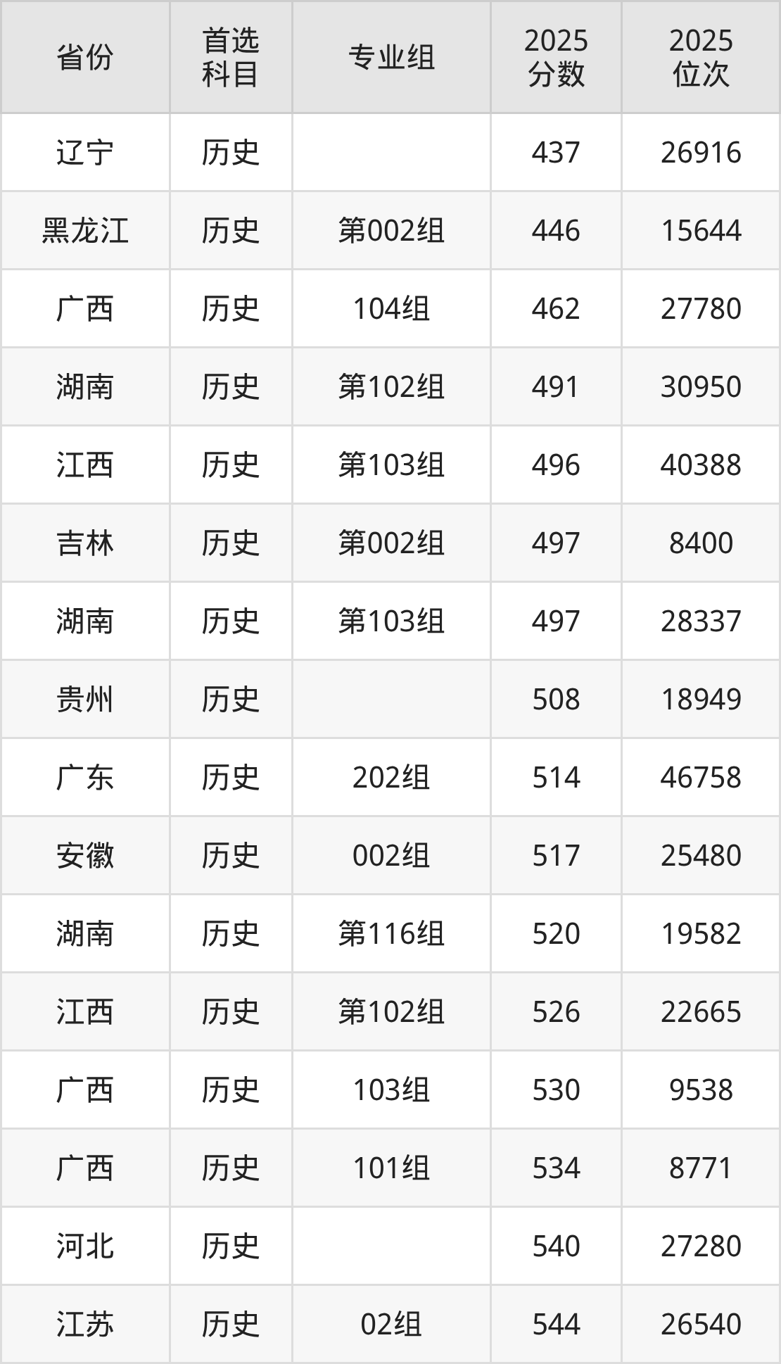 历史类:437分、26916名;