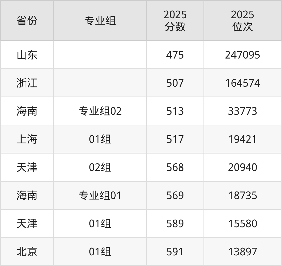 最低分对应地区为山东,录取位次为247095,超一段线34分;最高分对应地区为北京(01组),录取位次为13897,超本科线161分。
