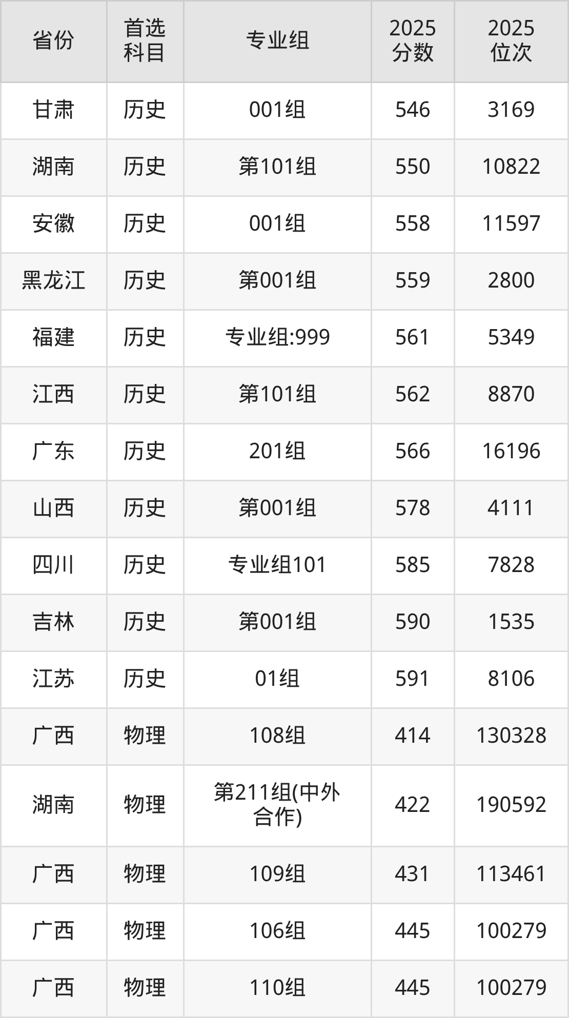 历史类最低分对应地区为辽宁,录取位次为26916,超本科线66分;最高分对应地区为江苏(01组),录取位次为8106,超本科线109分。