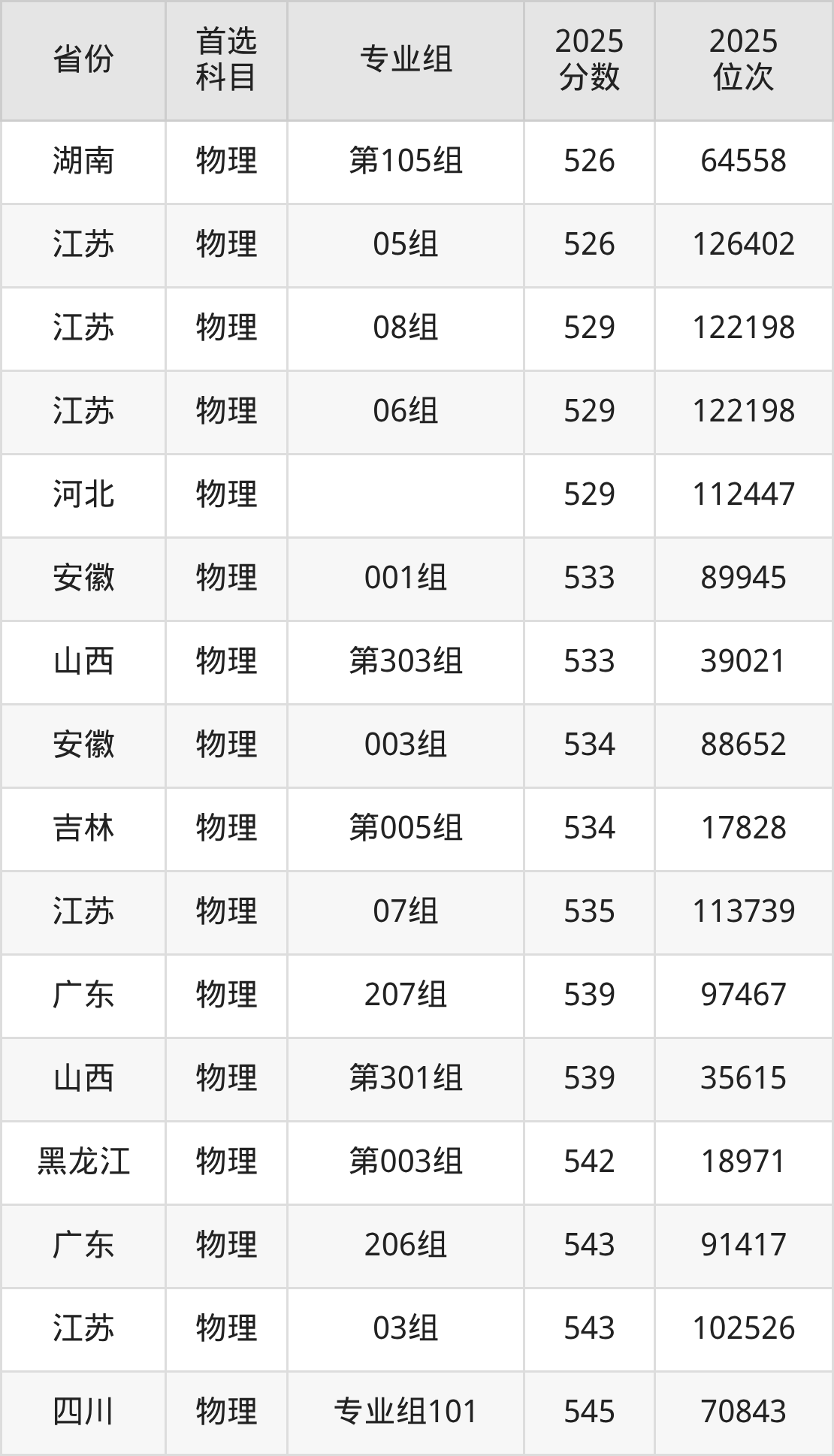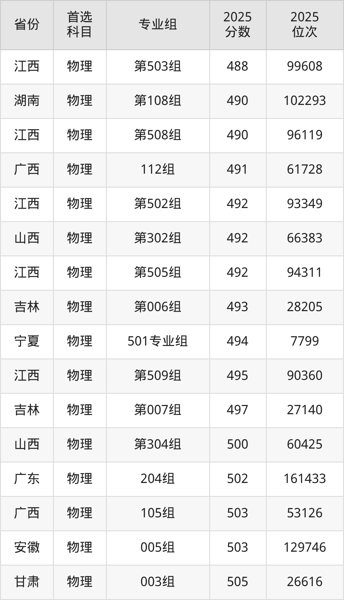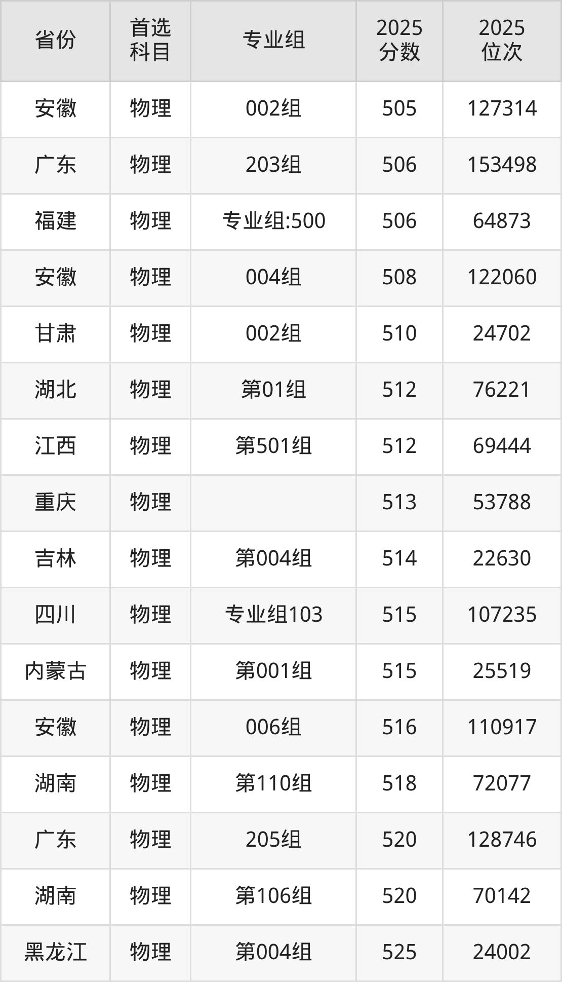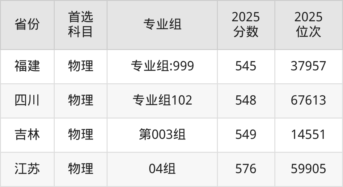 物理类最低分对应地区为广西(108组),录取位次为130328,超本科线44分;最高分对应地区为江苏(04组),录取位次为59905,超本科线113分。