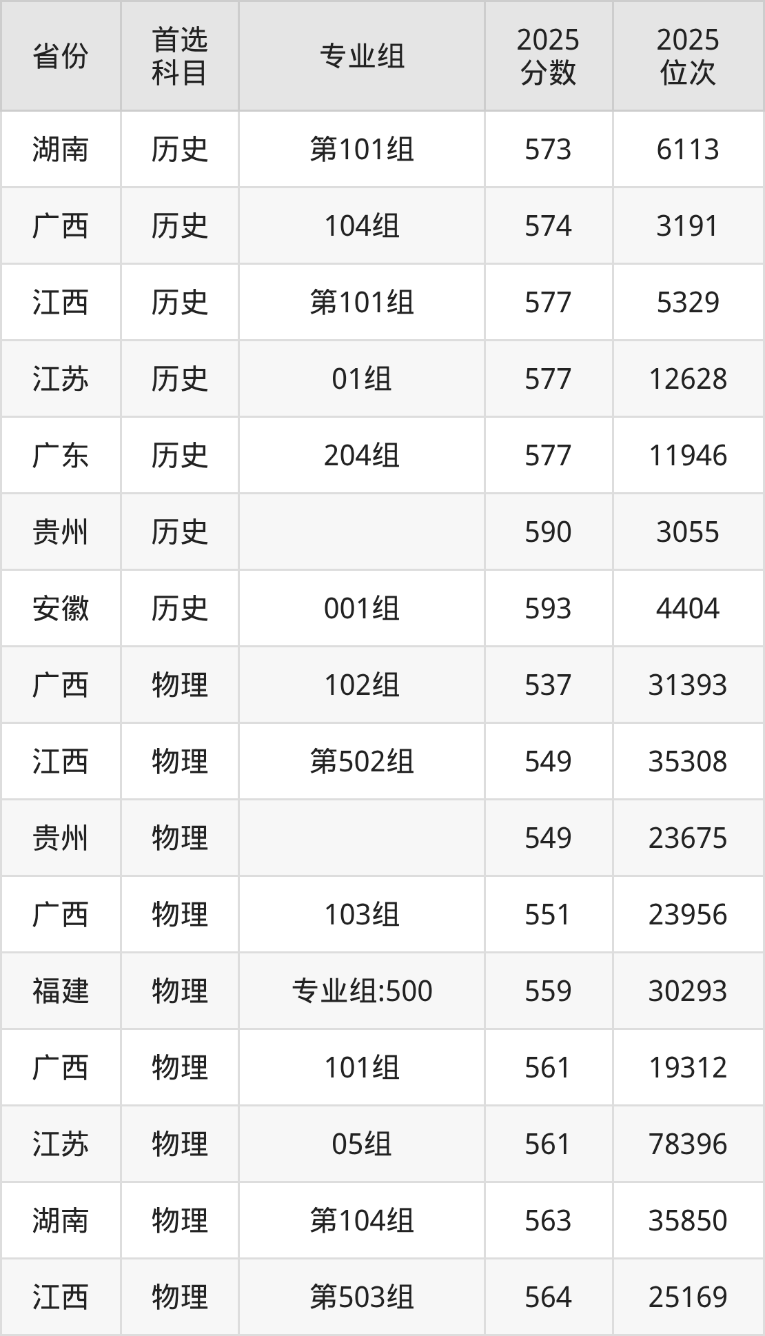 历史类最低分对应地区为湖南(第101组),录取位次为6113,超本科线127分;最高分对应地区为安徽(001组),录取位次为4404,超本科线116分。