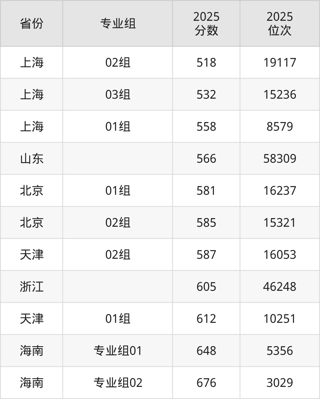 最低分对应地区为上海(02组),录取位次为19117,超本科线116分;最高分对应地区为海南(专业组02),录取位次为3029,超本科线196分。