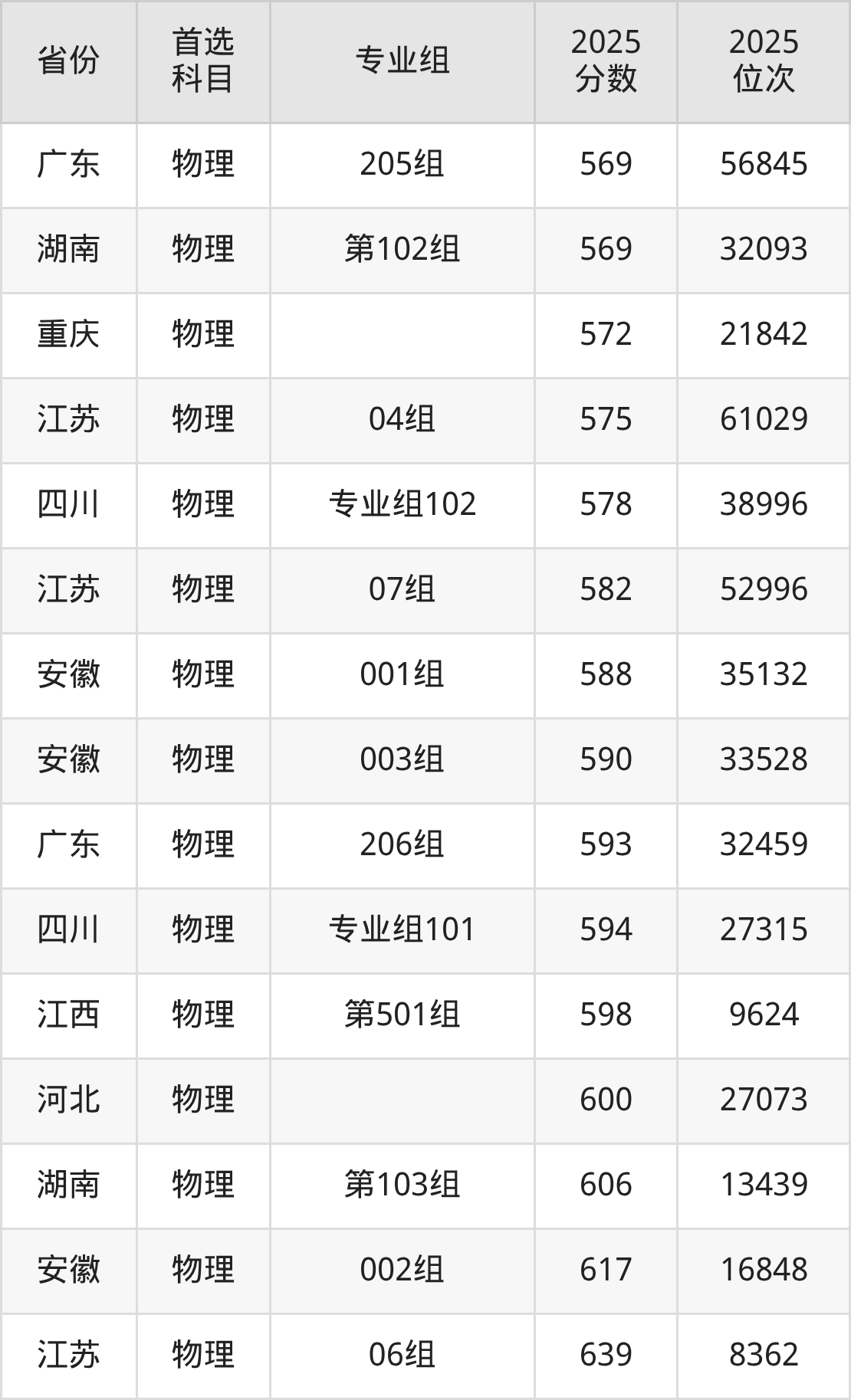 物理类最低分对应地区为广西(102组),录取位次为31393,超本科线167分;最高分对应地区为江苏(06组),录取位次为8362,超本科线176分。