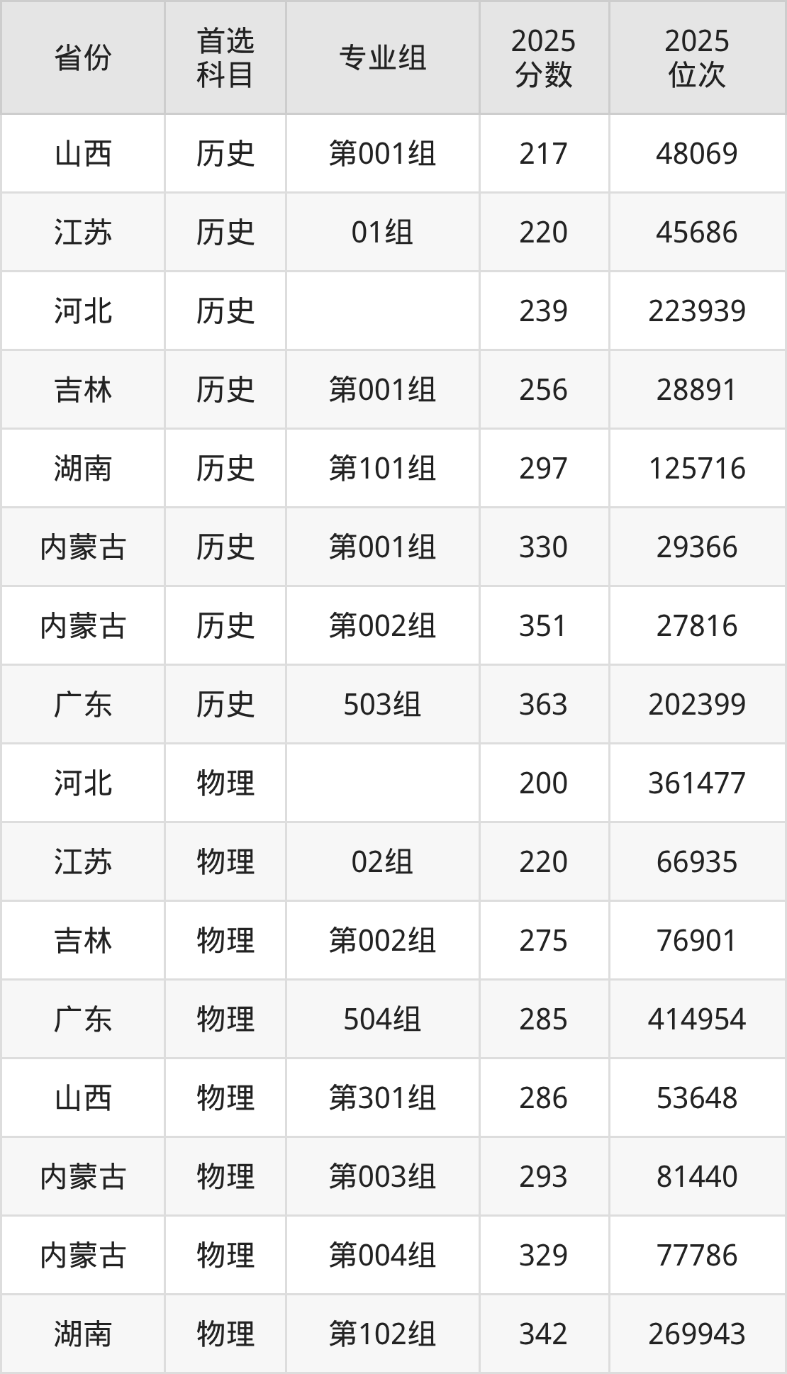 历史类最低分对应地区为山西(第001组),录取位次为48069,超专科线117分;最高分对应地区为广东(503组),录取位次为202399,超专科线148分。