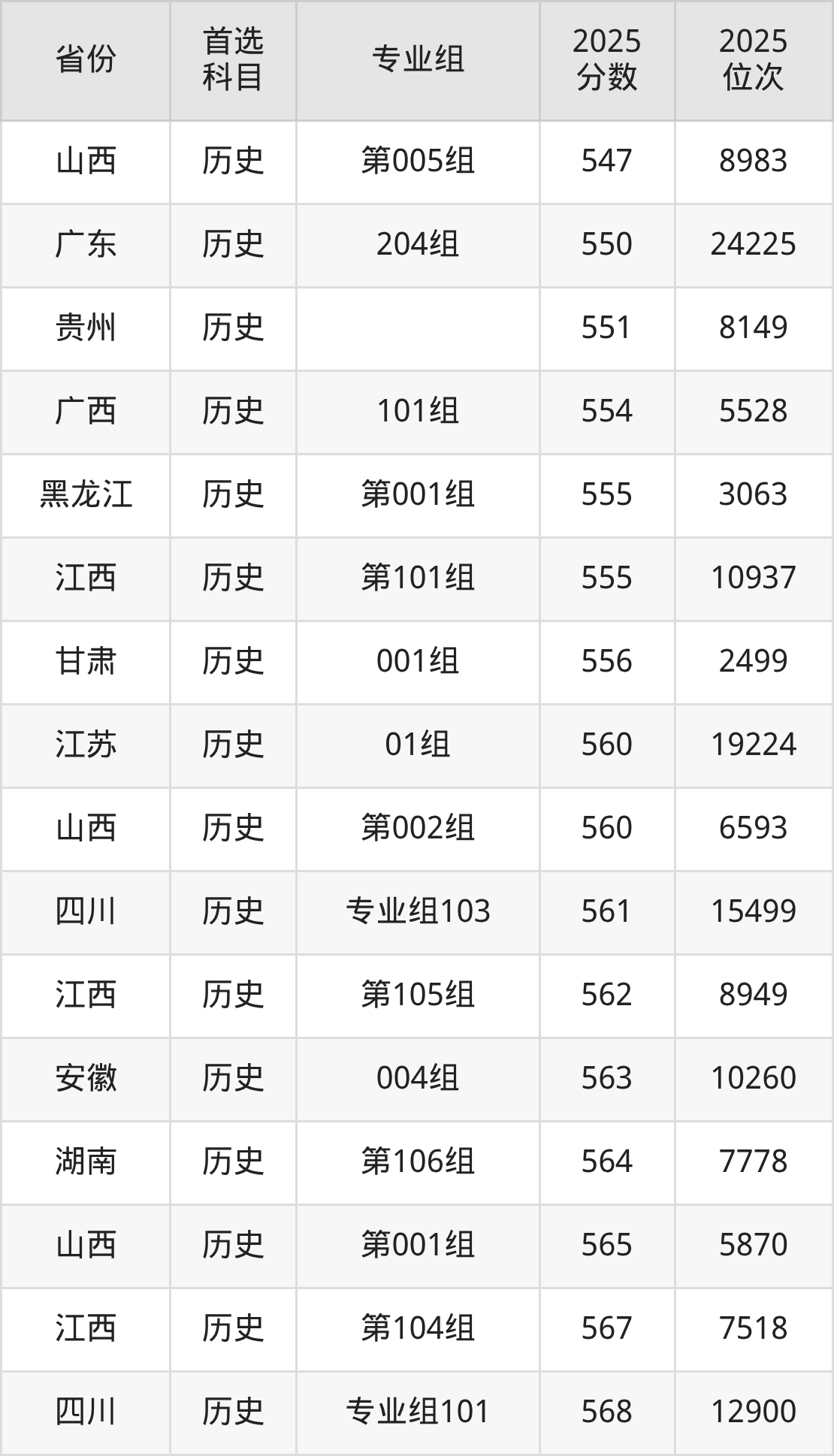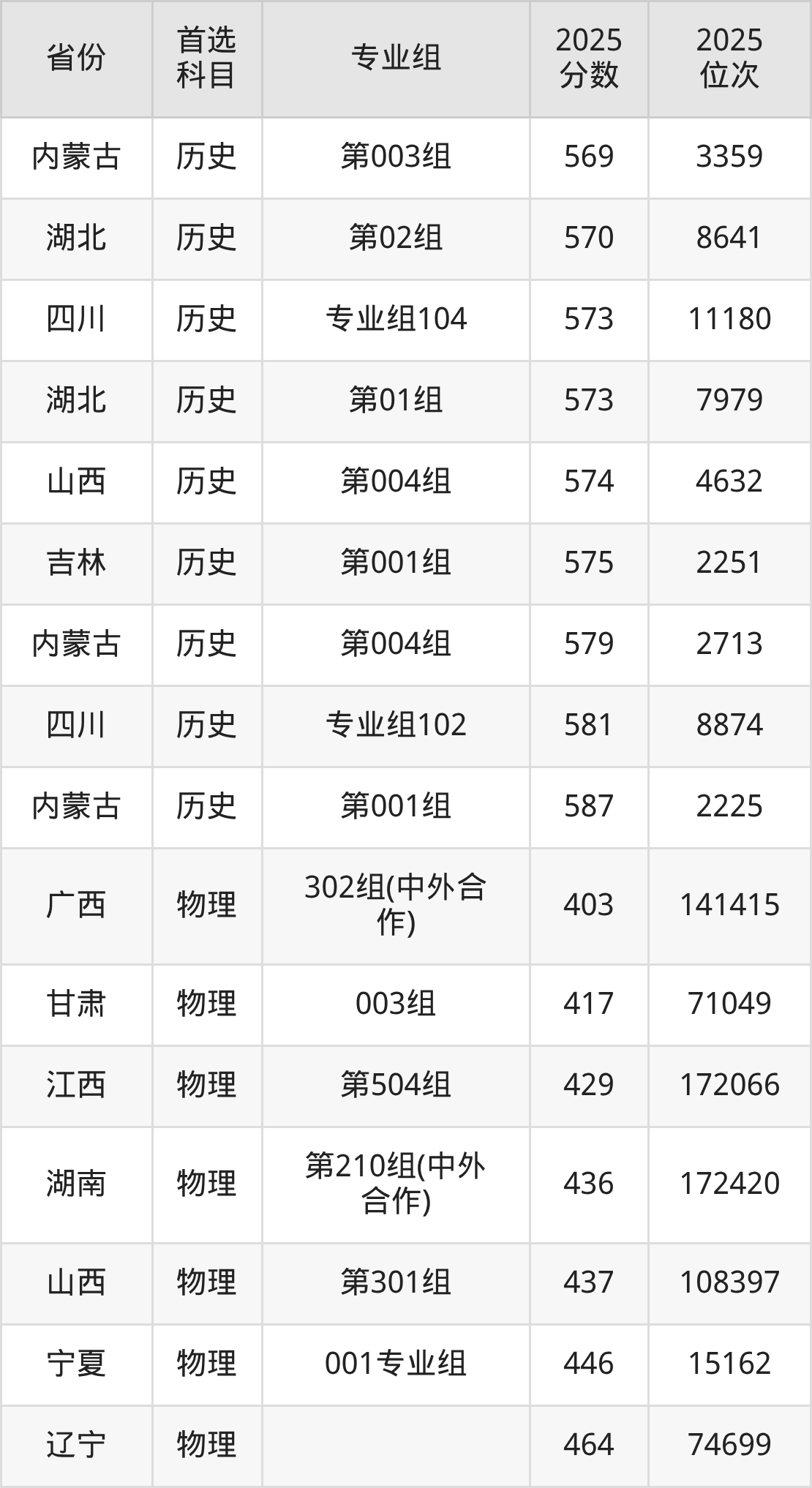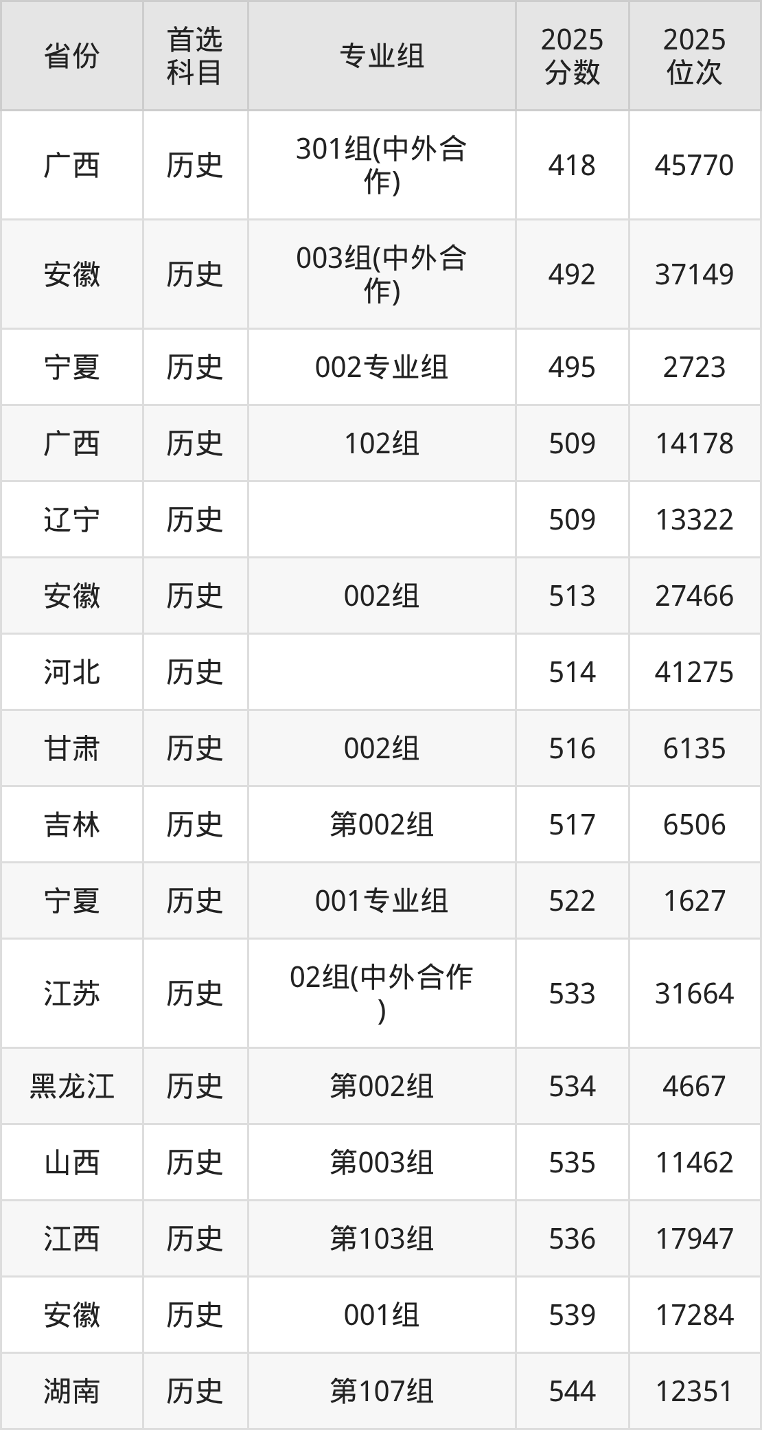 历史类最低分对应地区为广西(301组(中外合作)),录取位次为45770,超本科线16分;最高分对应地区为内蒙古(第001组),录取位次为2225,超本科线169分。