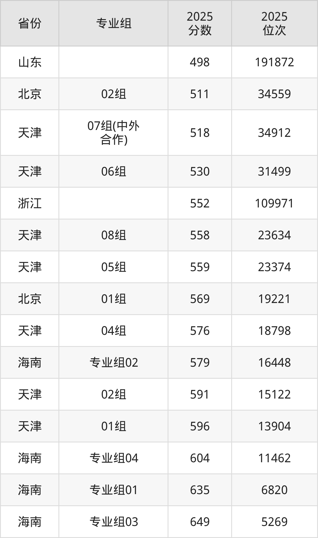 最低分对应地区为山东,录取位次为191872,超一段线57分;最高分对应地区为海南(专业组03),录取位次为5269,超本科线169分。