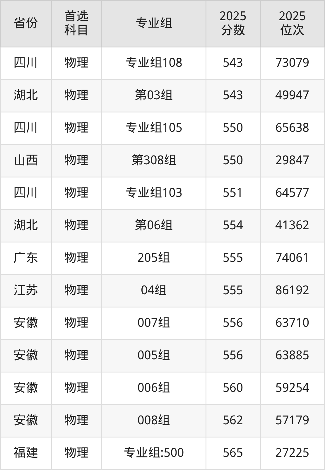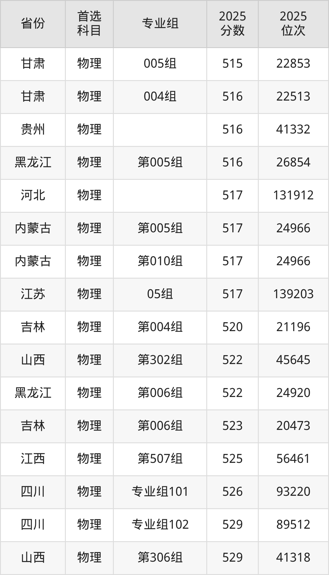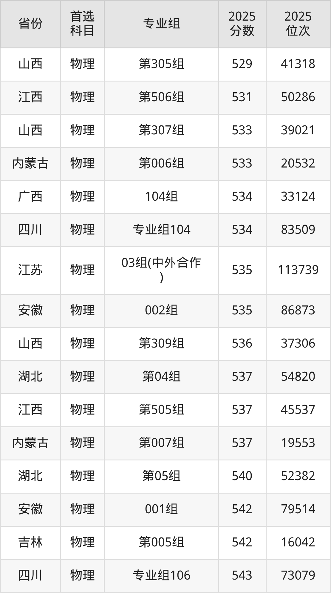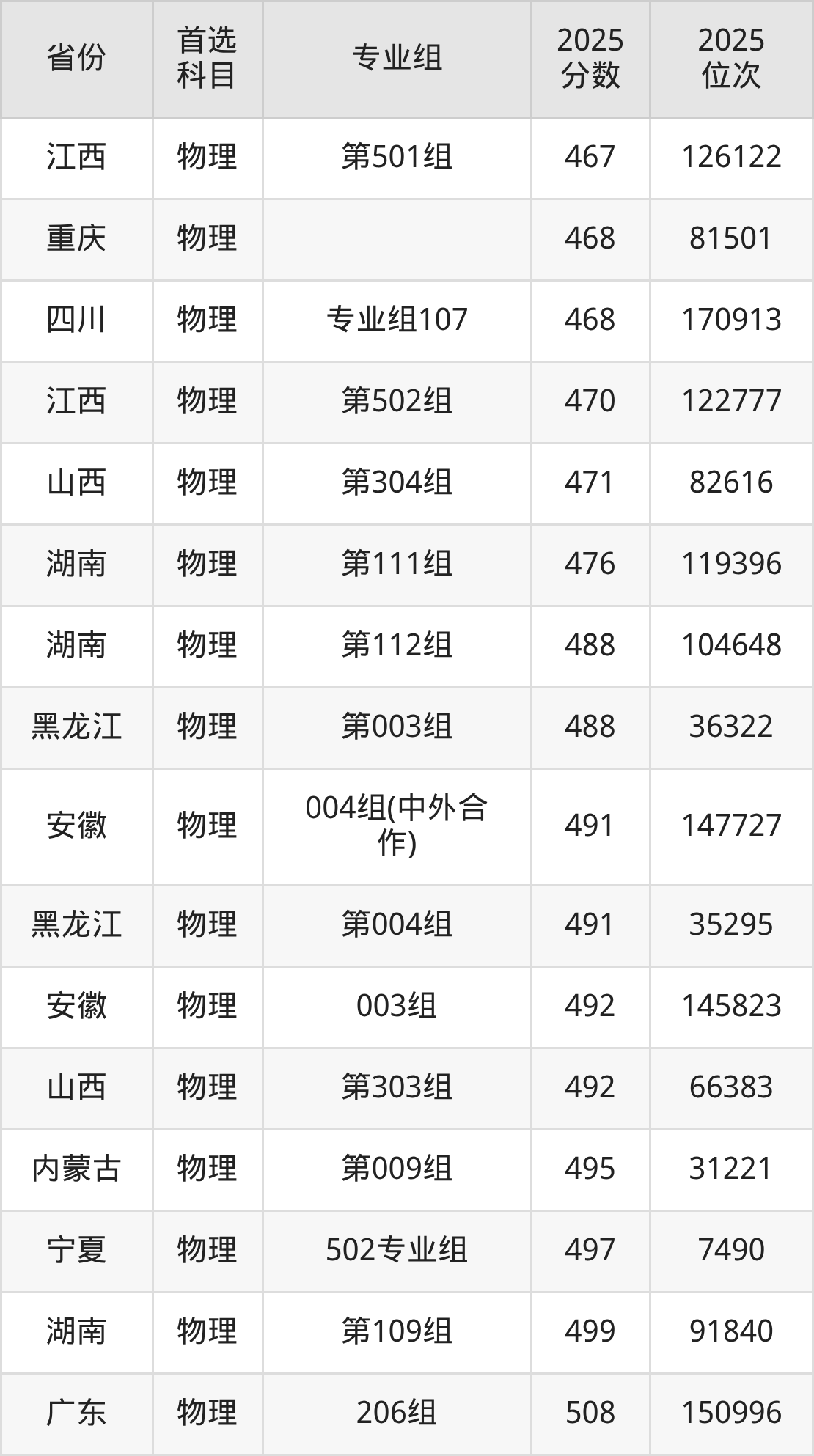 物理类最低分对应地区为广西(302组(中外合作)),录取位次为141415,超本科线33分;最高分对应地区为福建(专业组:500),录取位次为27225,超本科线124分。