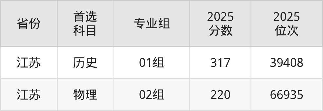 历史类最低分对应地区为江苏(01组),录取位次为39408,超专科线97分。