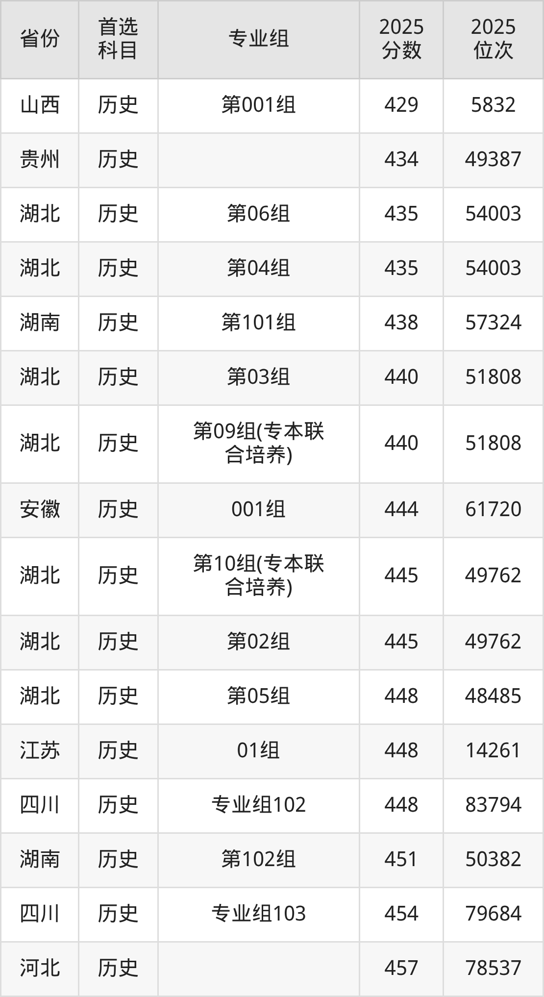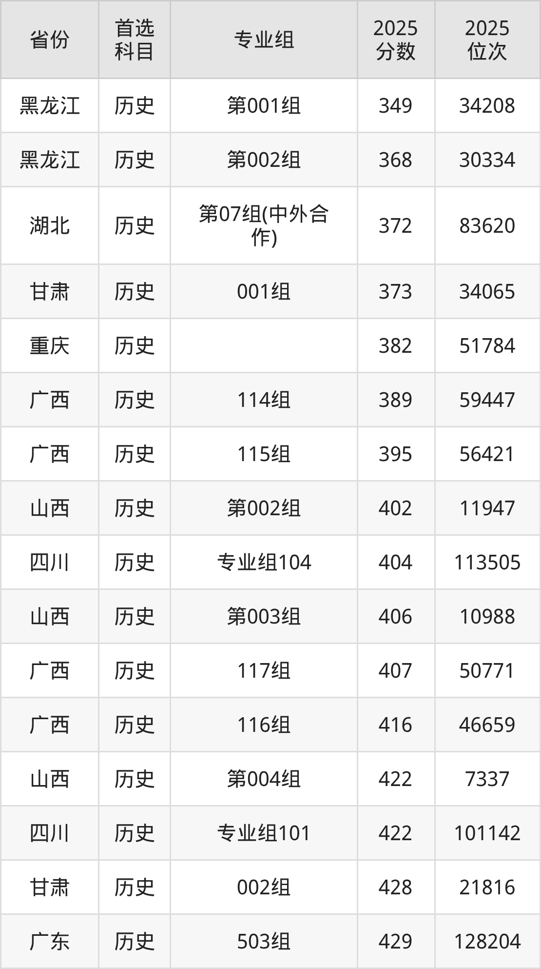 历史类:第01组459分、44035名,第02组445分、49762名,第03组440分、51808名,第04组435分、54003名,第05组448分、48485名,第06组435分、54003名,第07组(中外合作)372分、83620名,第08组(专本联合培养)473分、38579名,第09组(专本联合培养)440分、51808名,第10组(专本联合培养)445分、49762名;