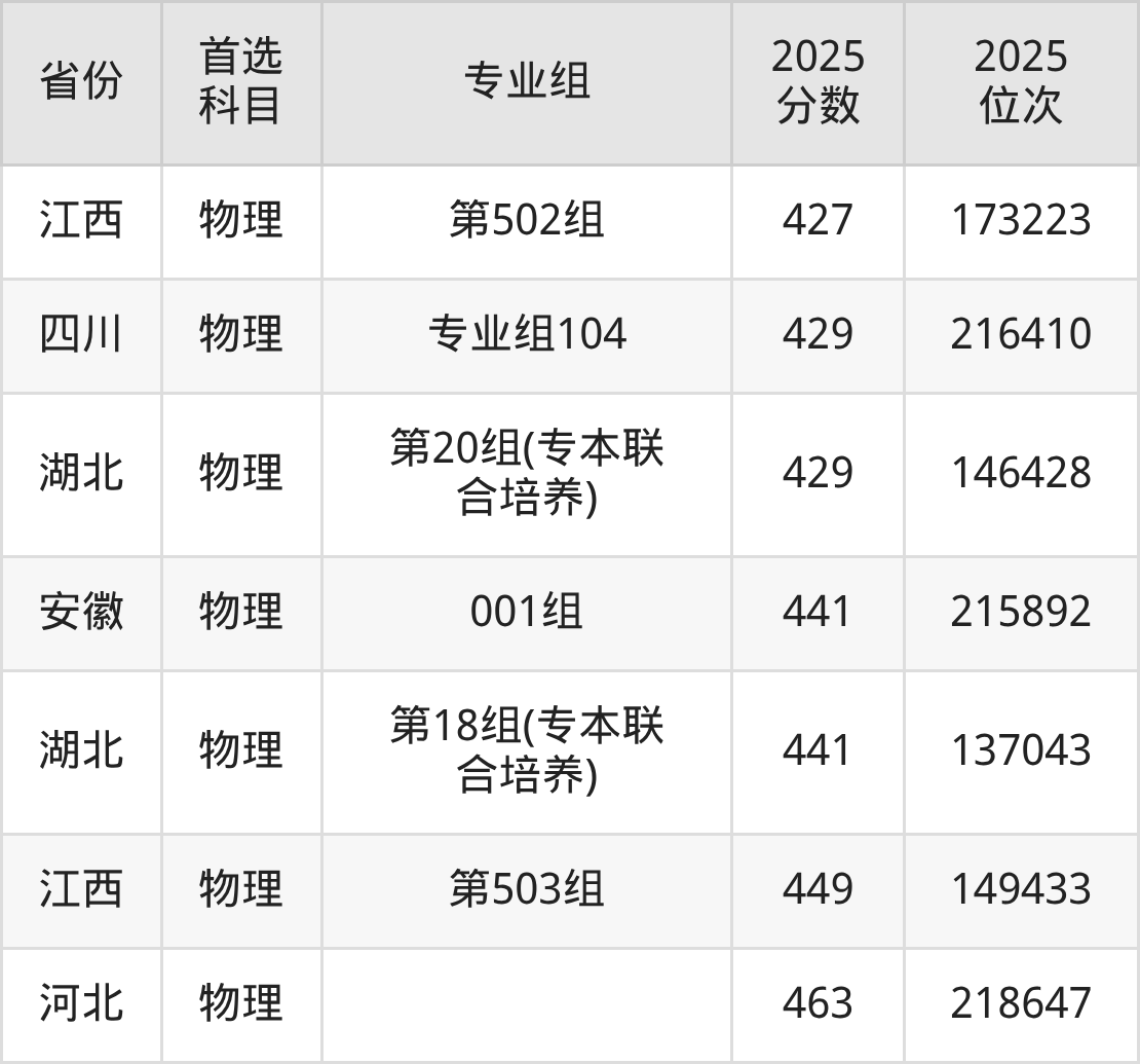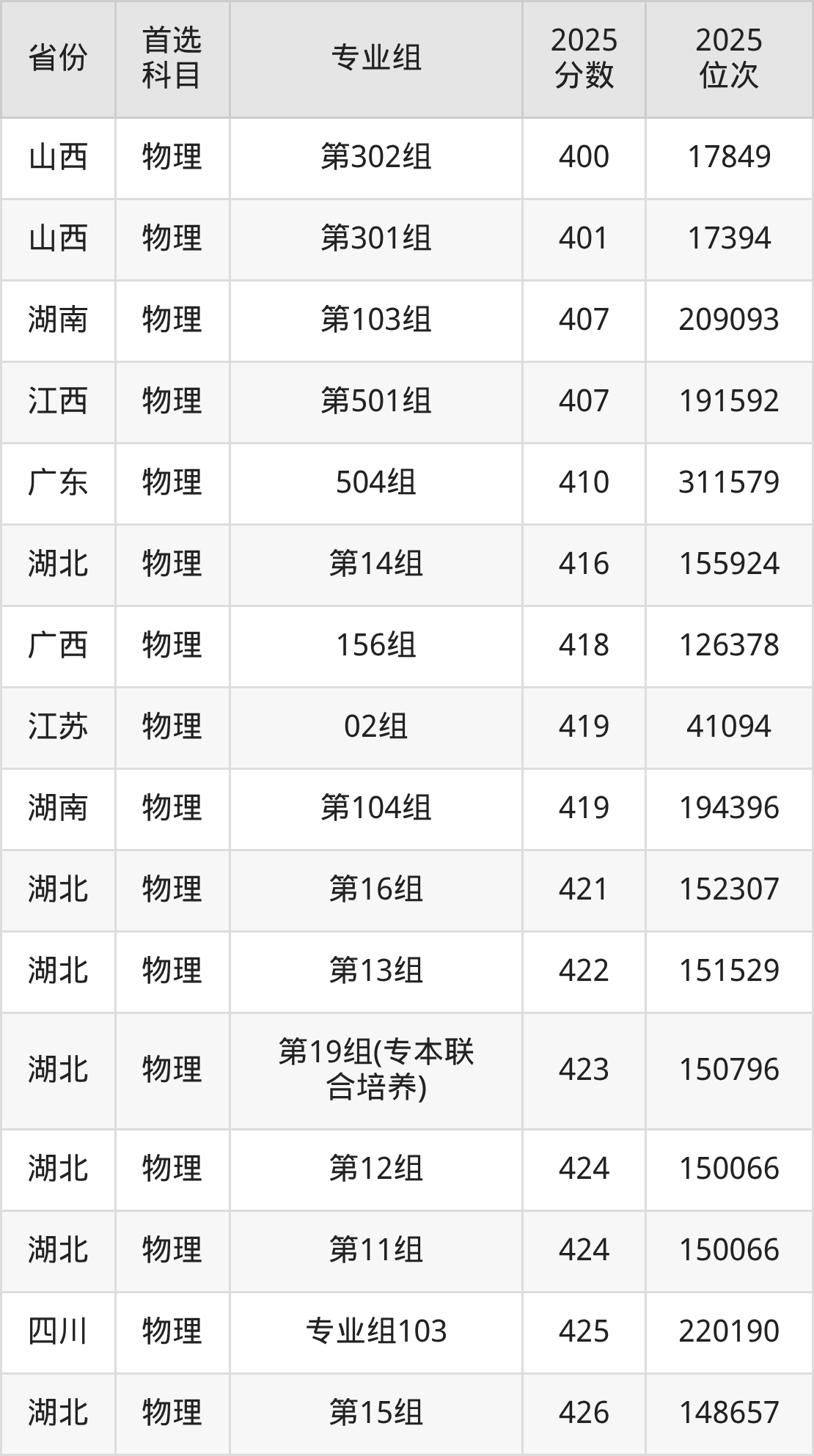 物理类:第11组426分、148429名,第12组426分、148429名,第13组427分、147694名,第14组425分、149173名,第15组428分、146946名,第16组429分、146179名,第17组(中外合作)391分、172109名,第18组(高职联办本科)432分、143981名,第19组(高职联办本科)434分、142516名,第20组(高职联办本科)436分、141000名;