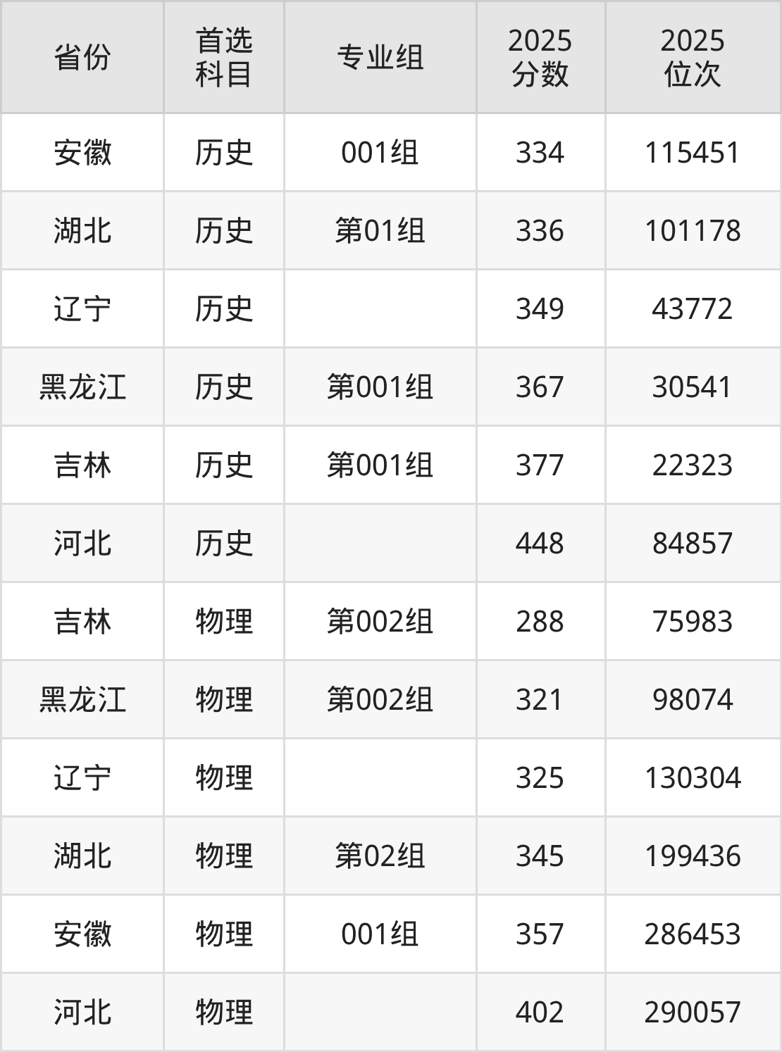 历史类最低分对应地区为安徽(001组),录取位次为115451,超专科线134分;最高分对应地区为河北,录取位次为84857,超专科线248分。