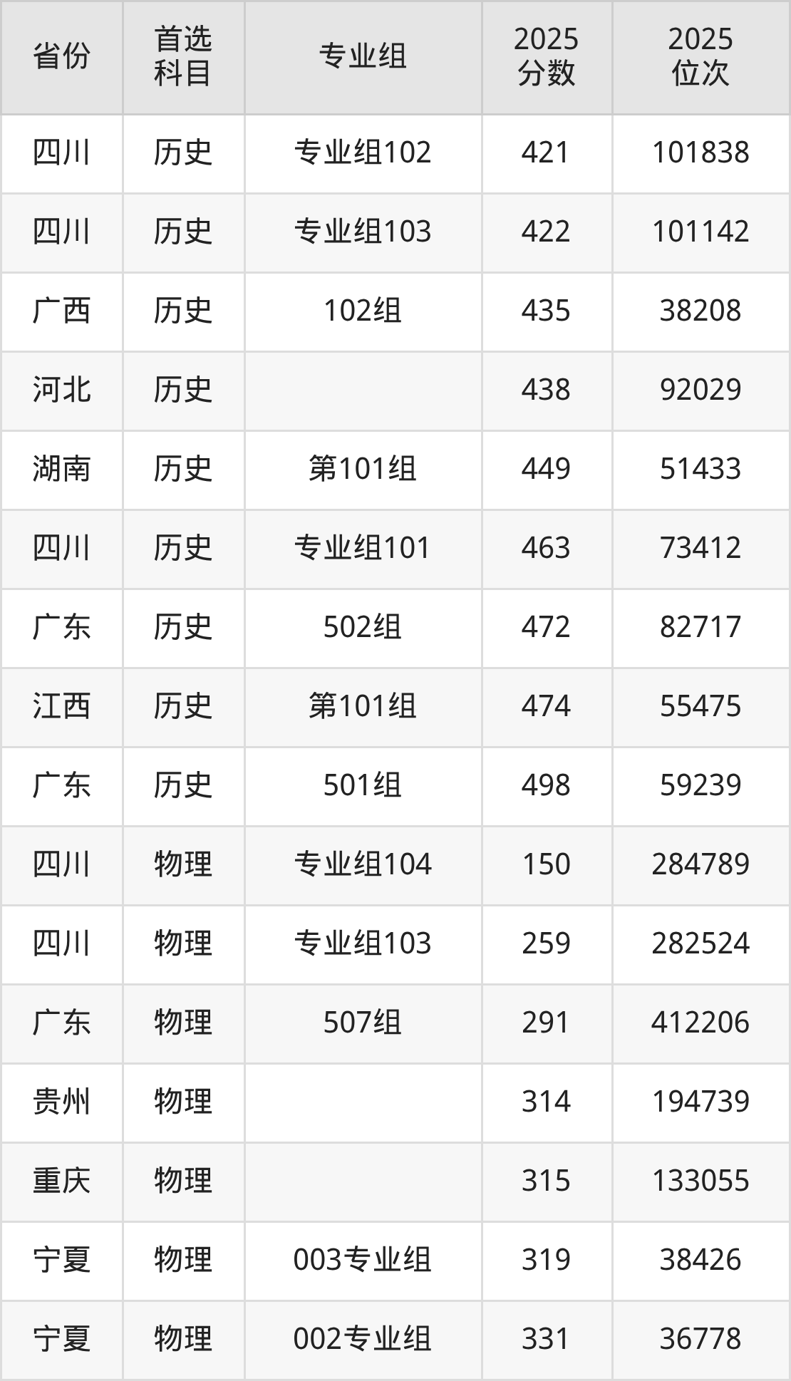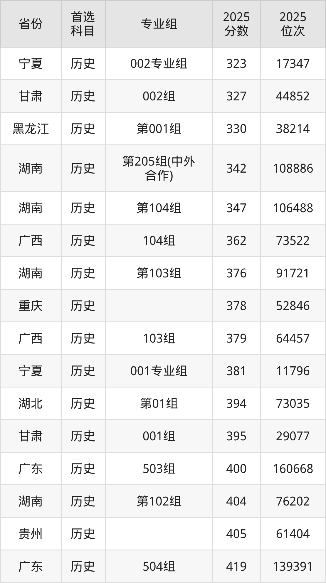 历史类:第101组449分、51433名,第102组404分、76202名,第103组376分、91721名,第104组347分、106488名,第205组(中外合作)342分、108886名;