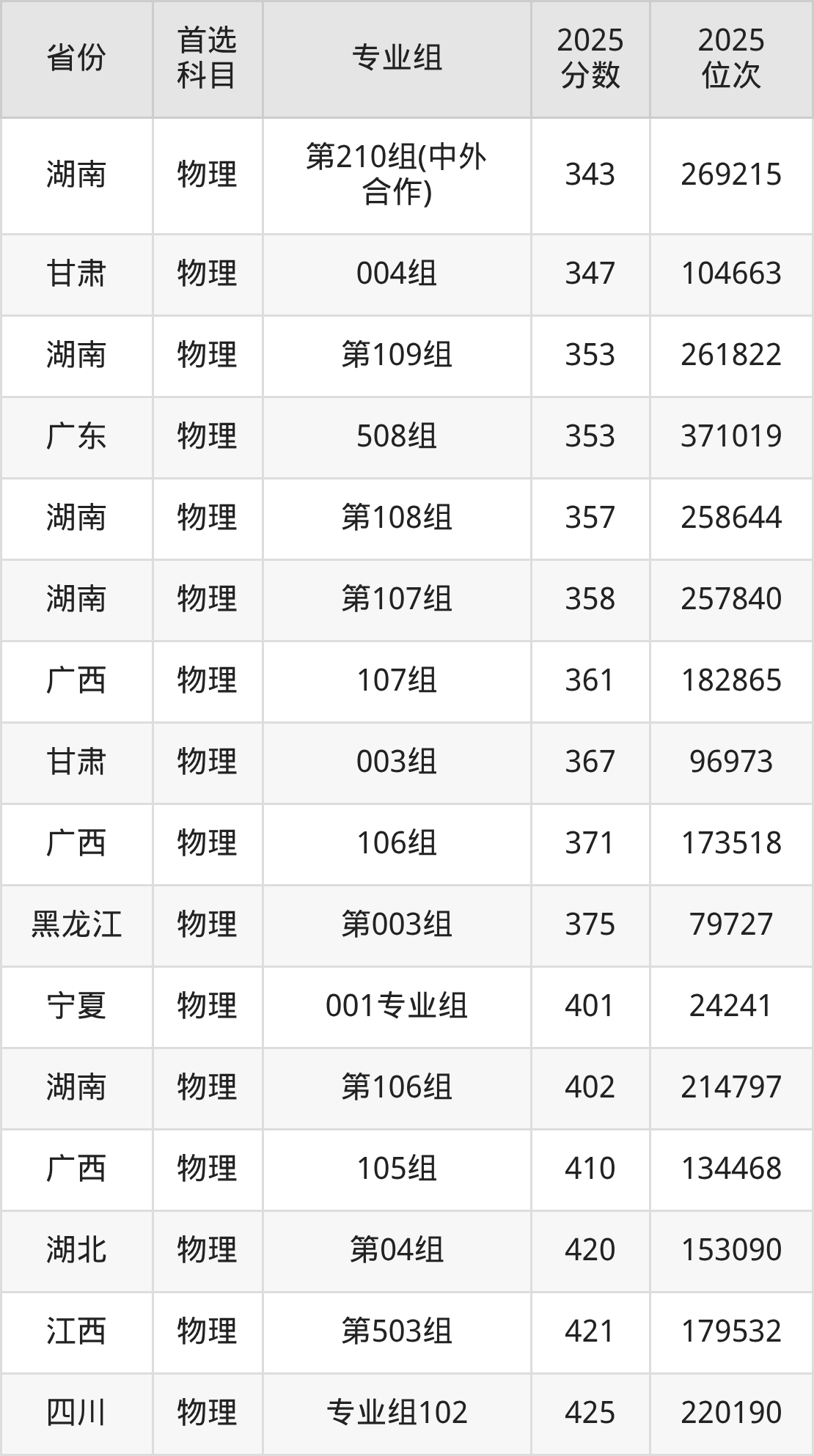 物理类:第106组402分、214797名,第107组358分、257840名,第108组357分、258644名,第109组353分、261822名,第210组(中外合作)343分、269215名;