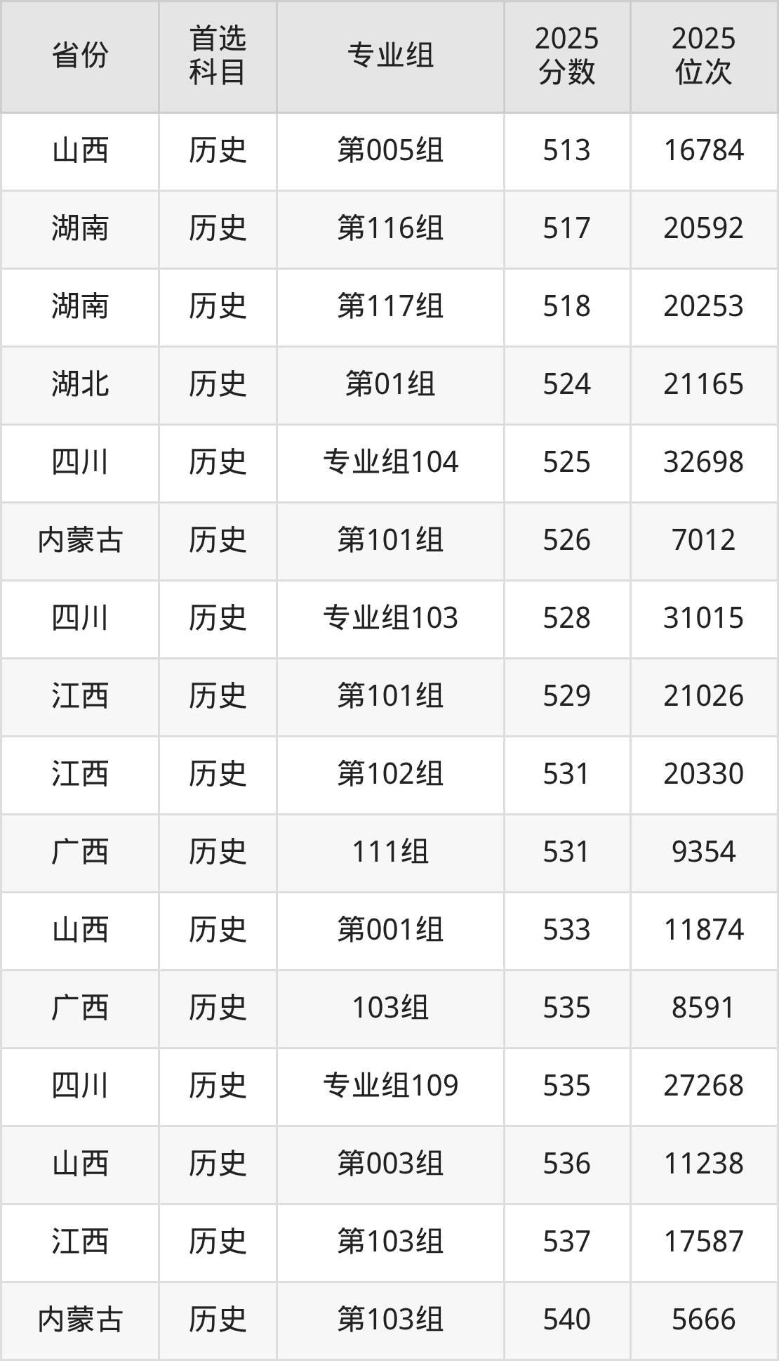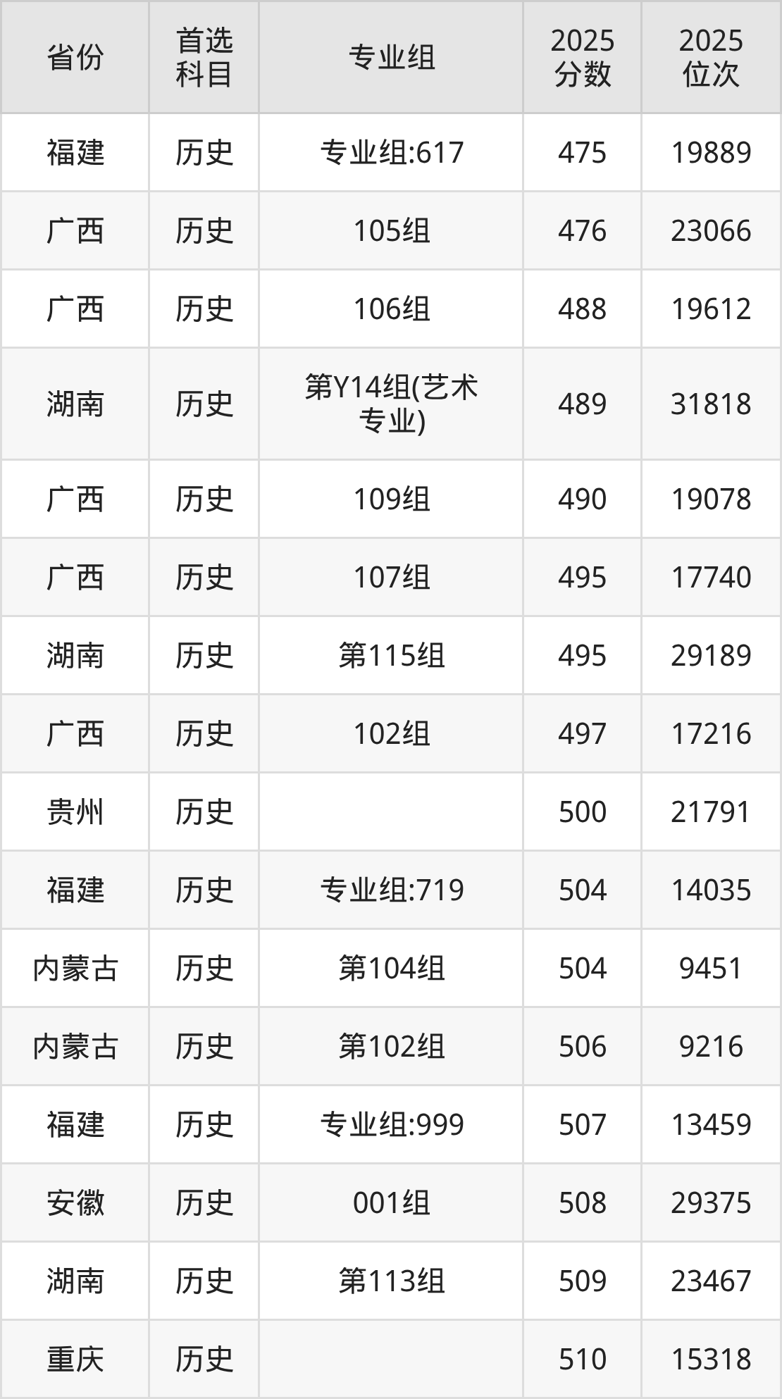 历史类最低分对应地区为福建(专业组:617),录取位次为19889,超本科线25分;最高分对应地区为四川(专业组101),录取位次为10596,超本科B108分。