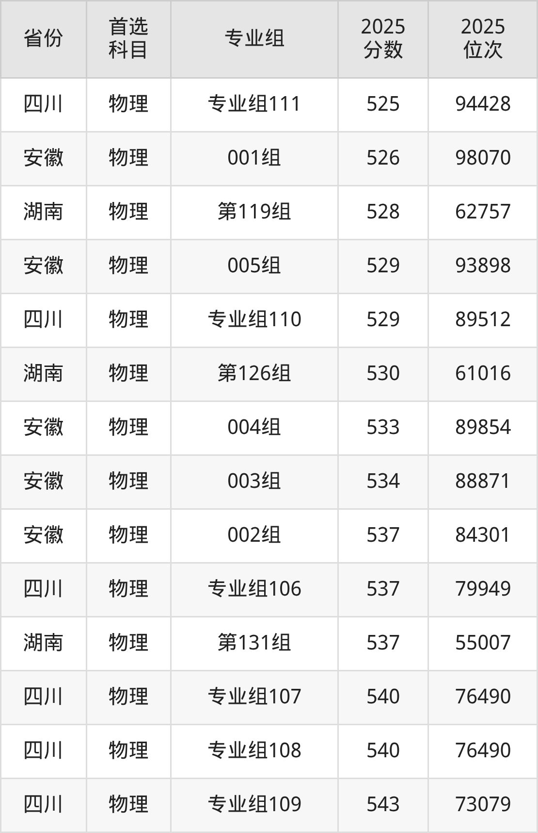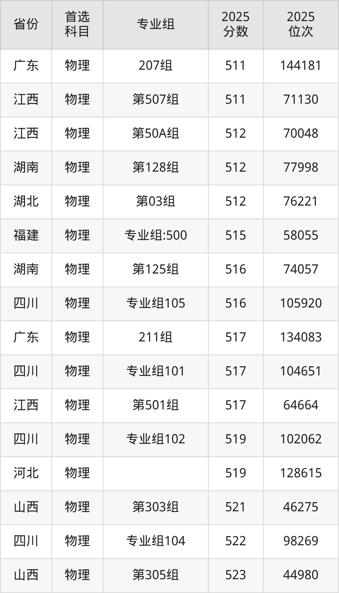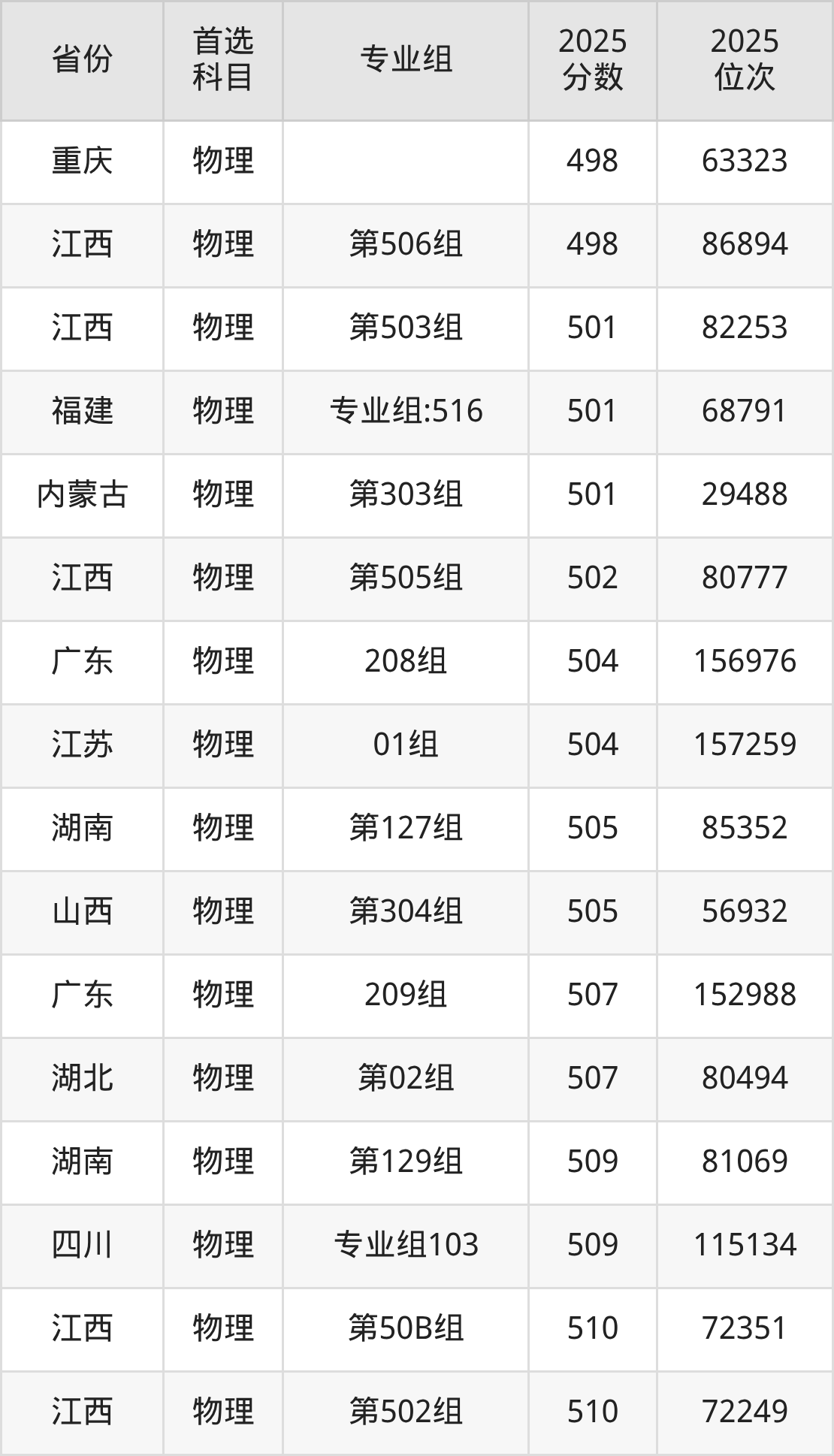 物理类最低分对应地区为湖南(第122组),录取位次为181701,超本科线24分;最高分对应地区为四川(专业组109),录取位次为73079,超本科B105分。