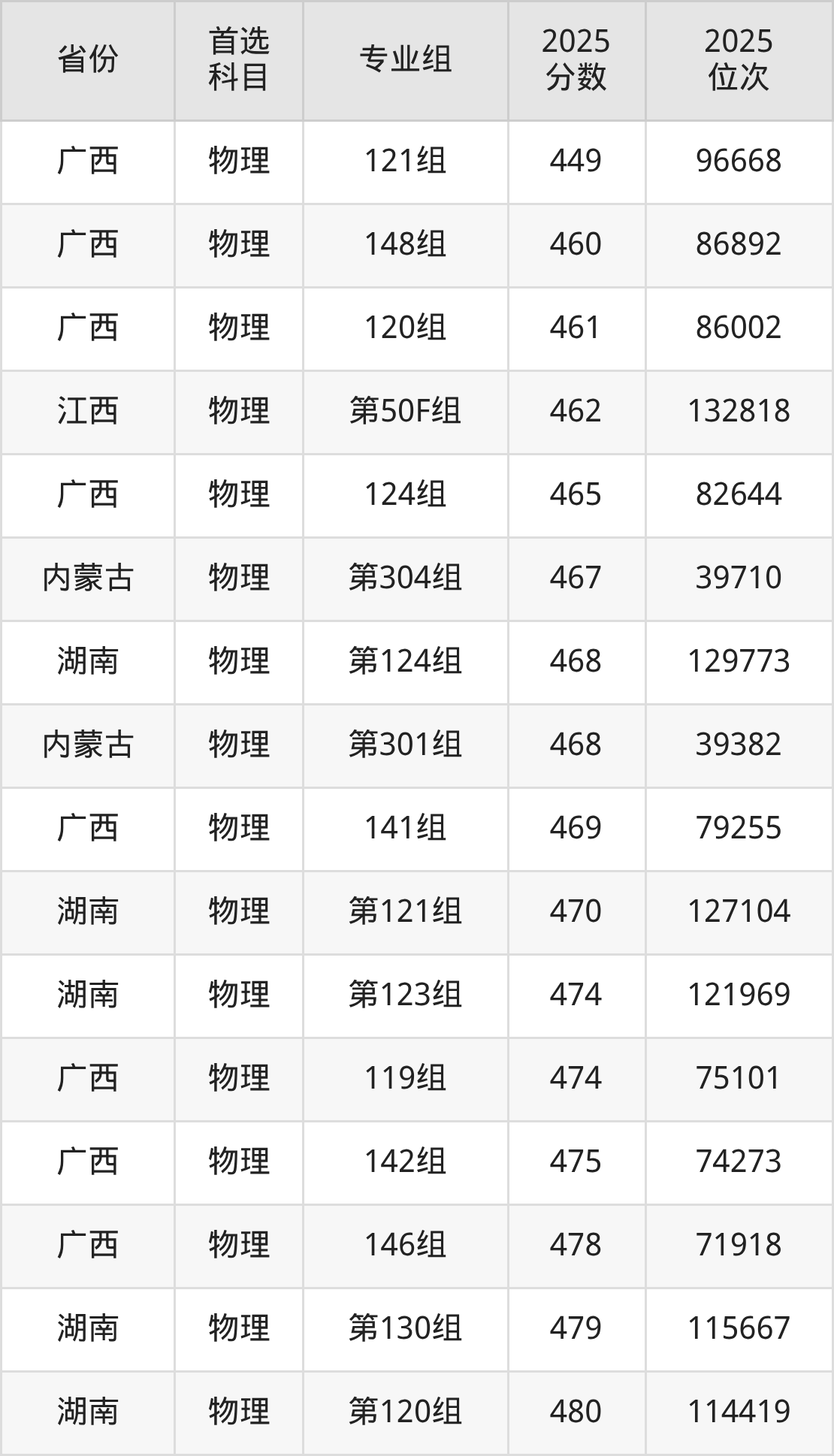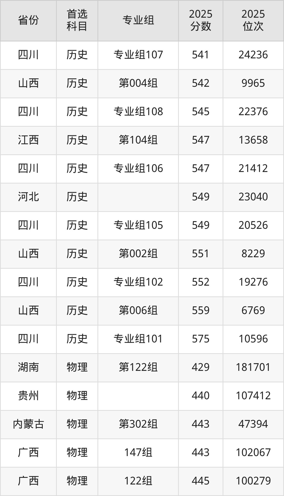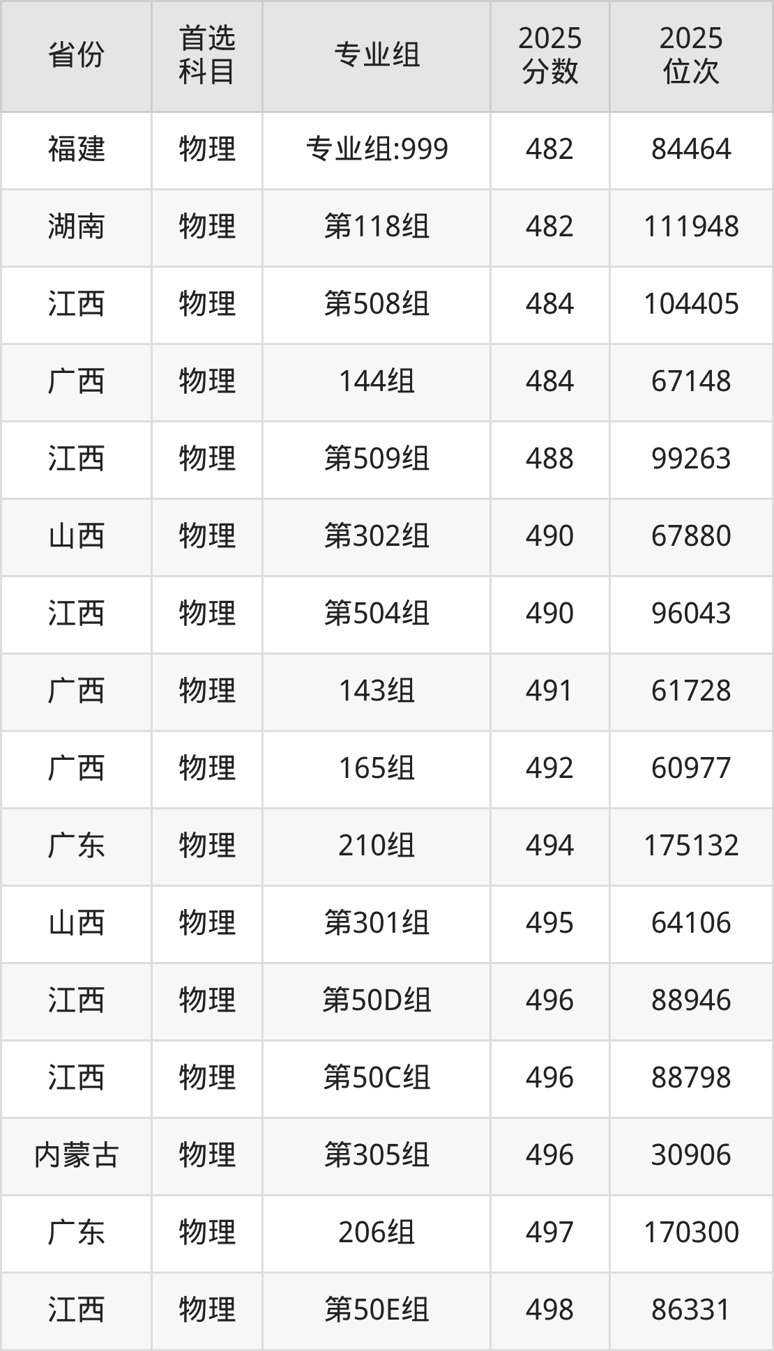 物理类最低分对应地区为湖南(第122组),录取位次为181701,超本科线24分;最高分对应地区为四川(专业组109),录取位次为73079,超本科B105分。