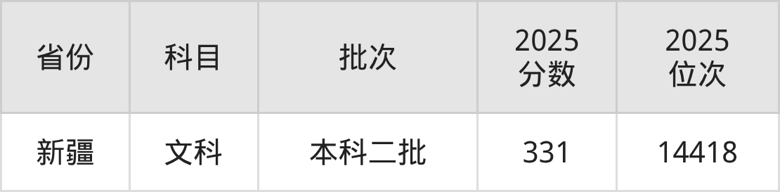 文科最低分对应地区为新疆,录取位次为14418,超二本线1分。
