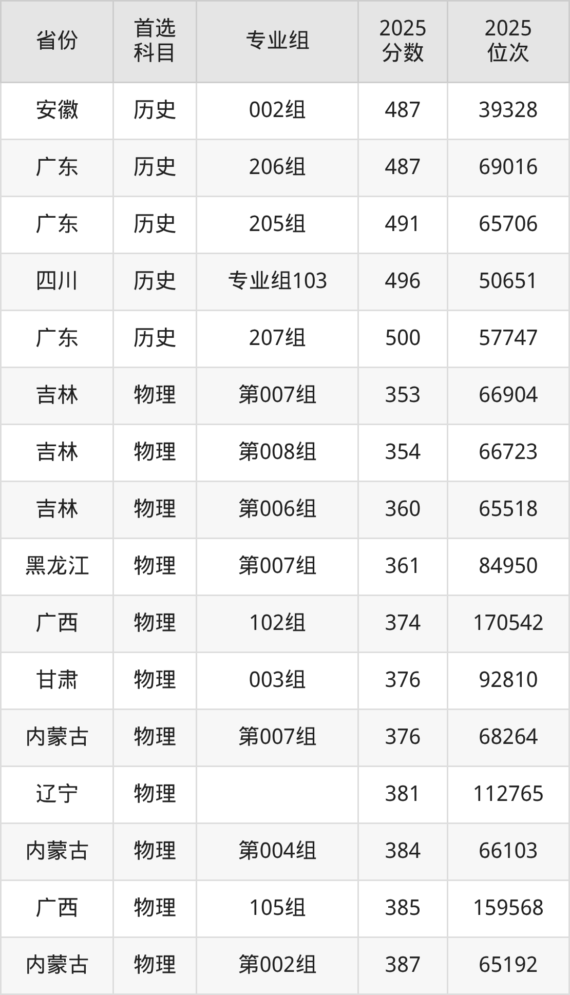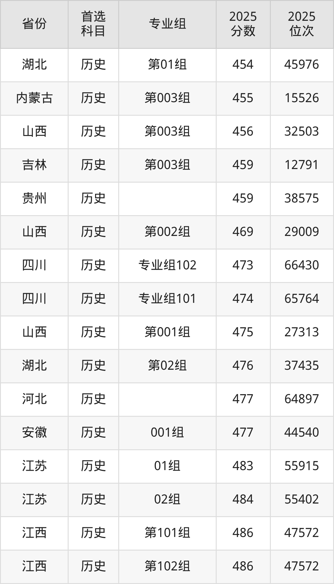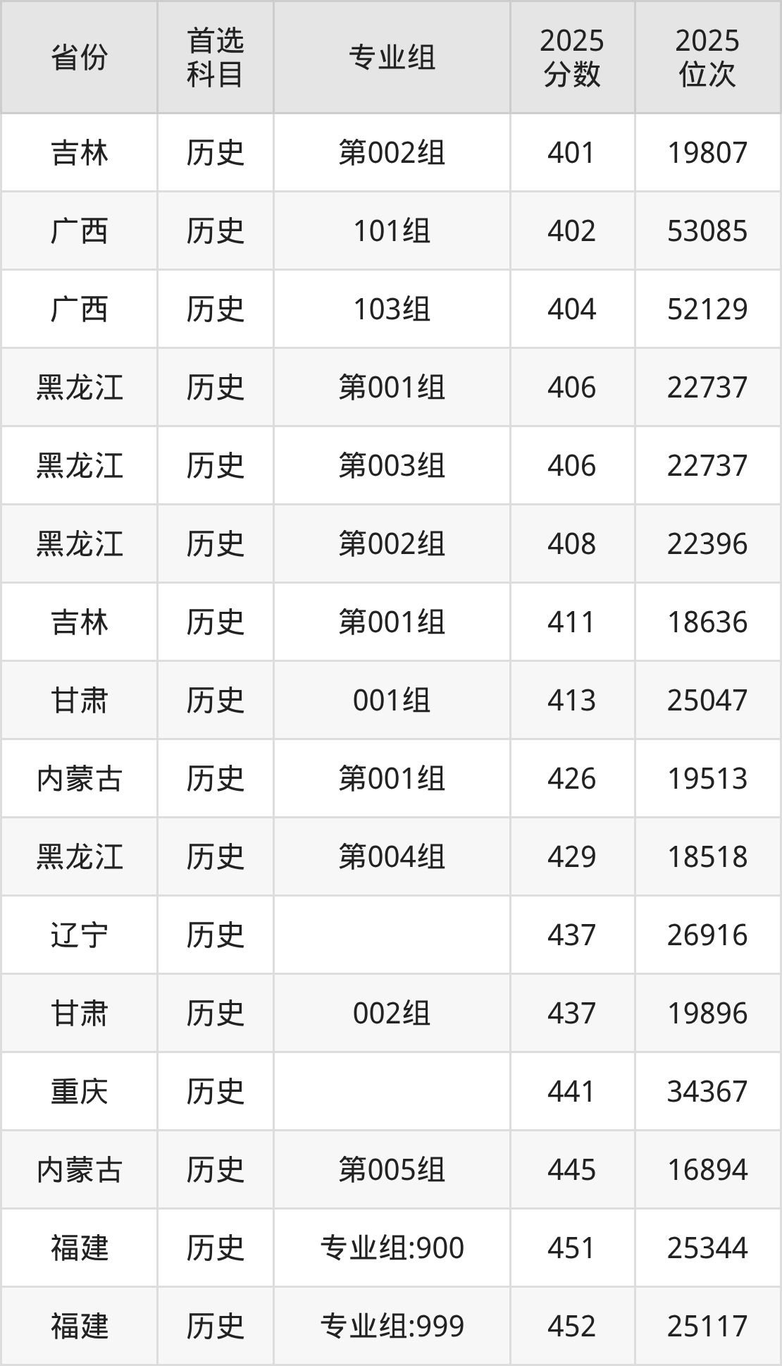 历史类最低分对应地区为吉林(第002组),录取位次为19807,超本科线17分;最高分对应地区为广东(207组),录取位次为57747,超本科线36分。