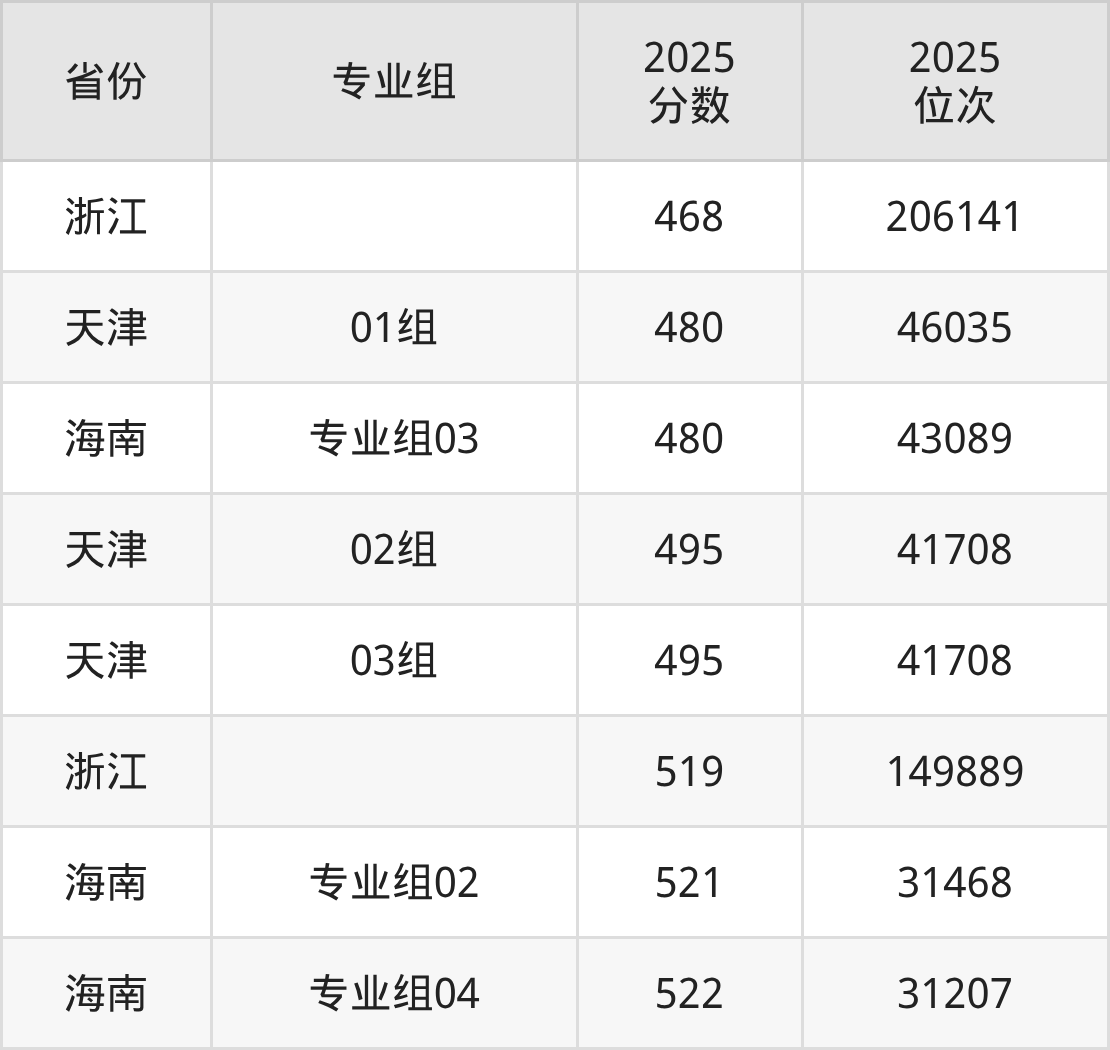 最低分对应地区为浙江,录取位次为206141;最高分对应地区为海南(专业组04),录取位次为31207,超本科线42分。