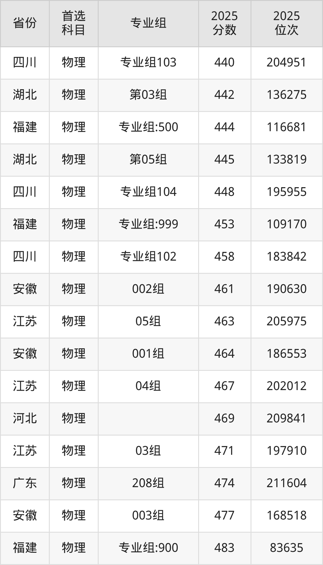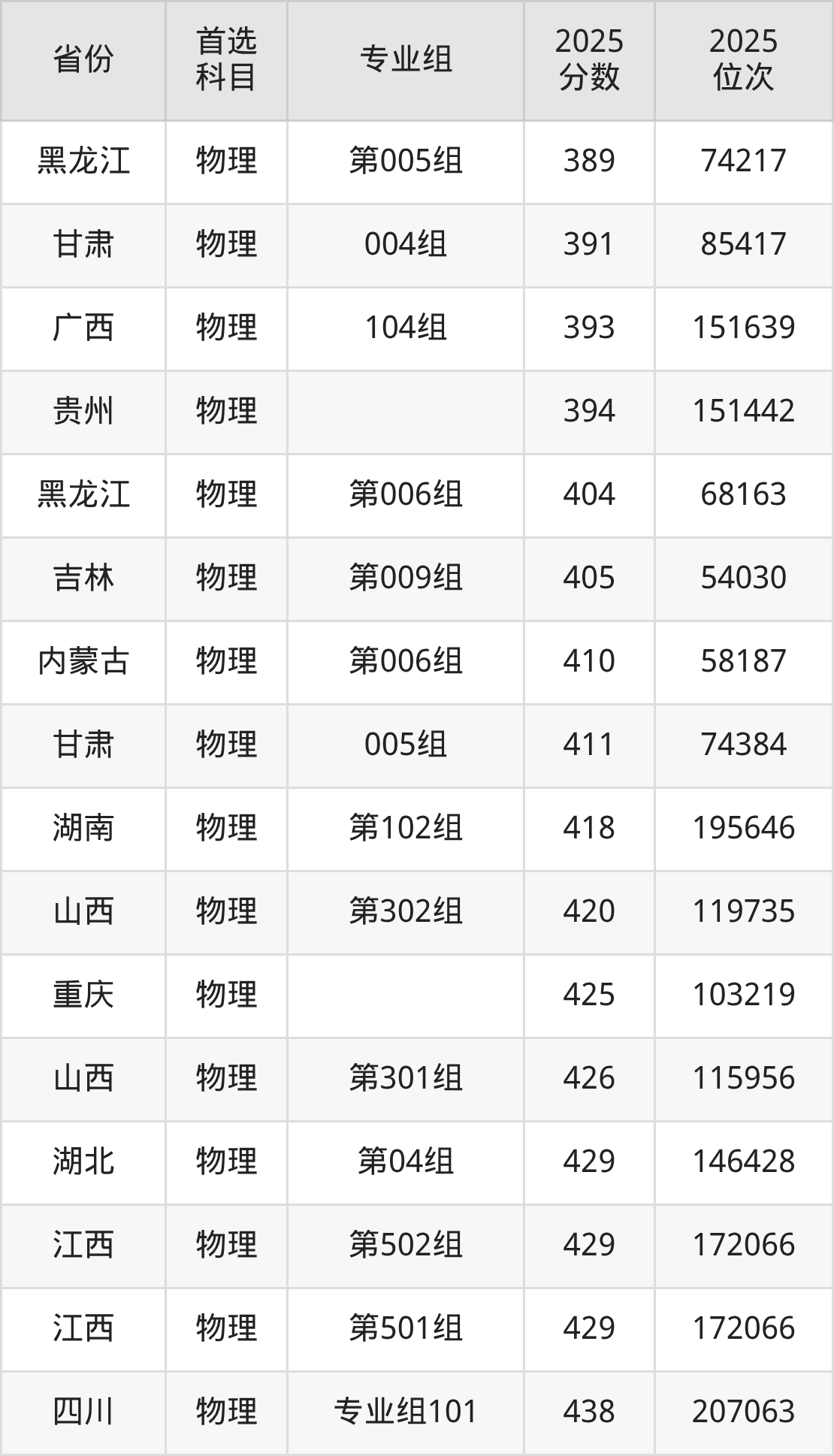 物理类:第006组391分、57297名,第007组370分、62881名,第008组370分、62881名,第009组410分、51806名,第015组294分、77905名;
