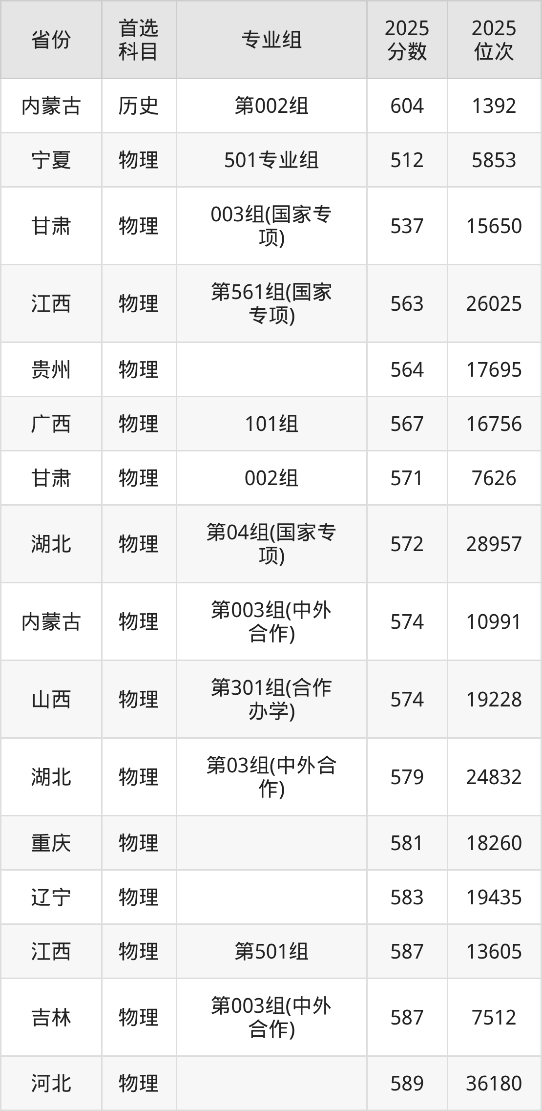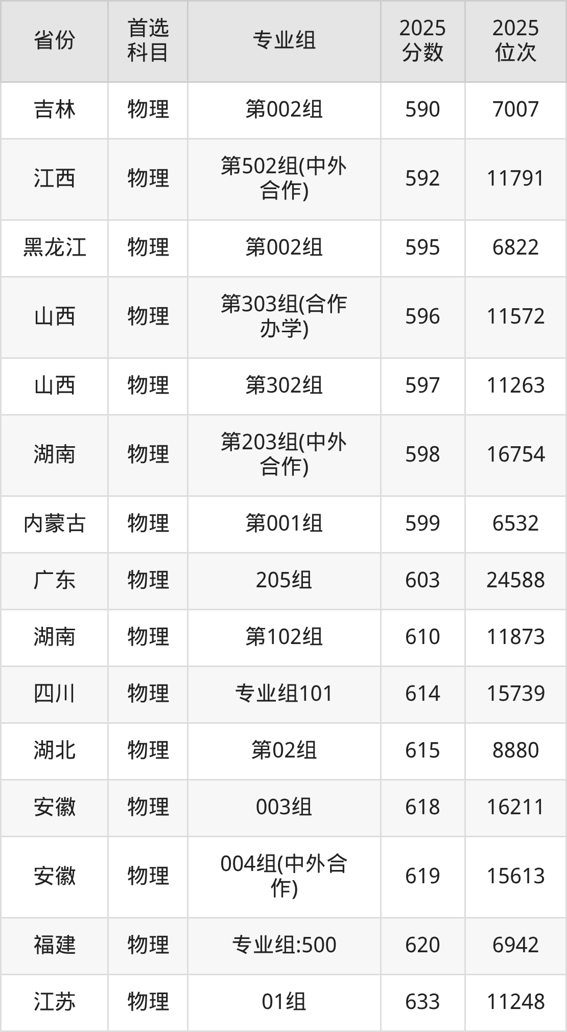 物理类最低分对应地区为宁夏(501专业组),录取位次为5853;最高分对应地区为江苏(01组),录取位次为11248。