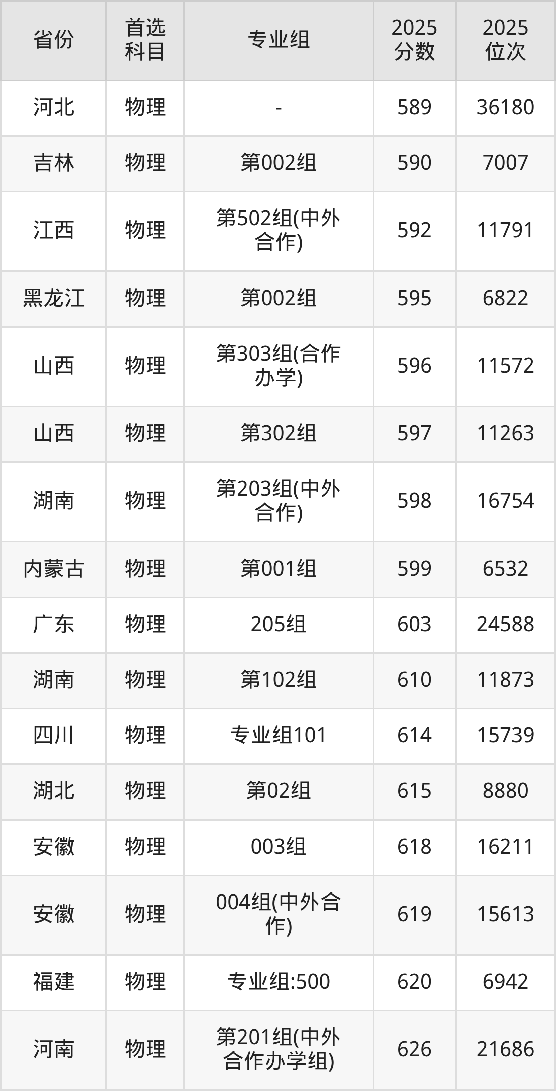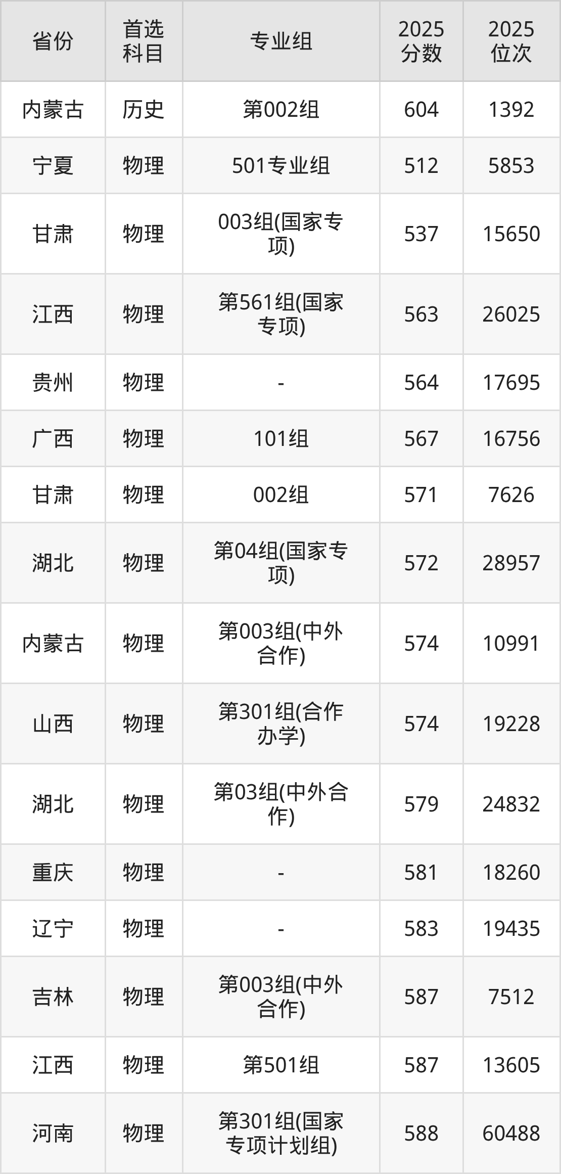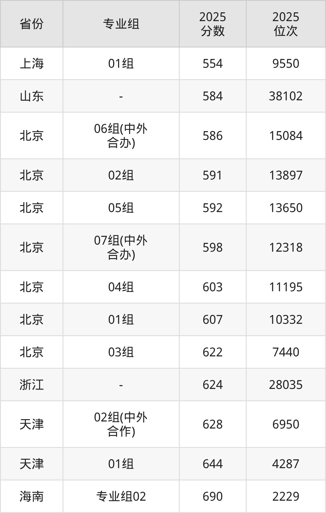 01组599分、10508名,02组595分、11275名,03组592分、11858名,04组(中外合办)592分、11858名,05组(中外合办)593分、11658名。