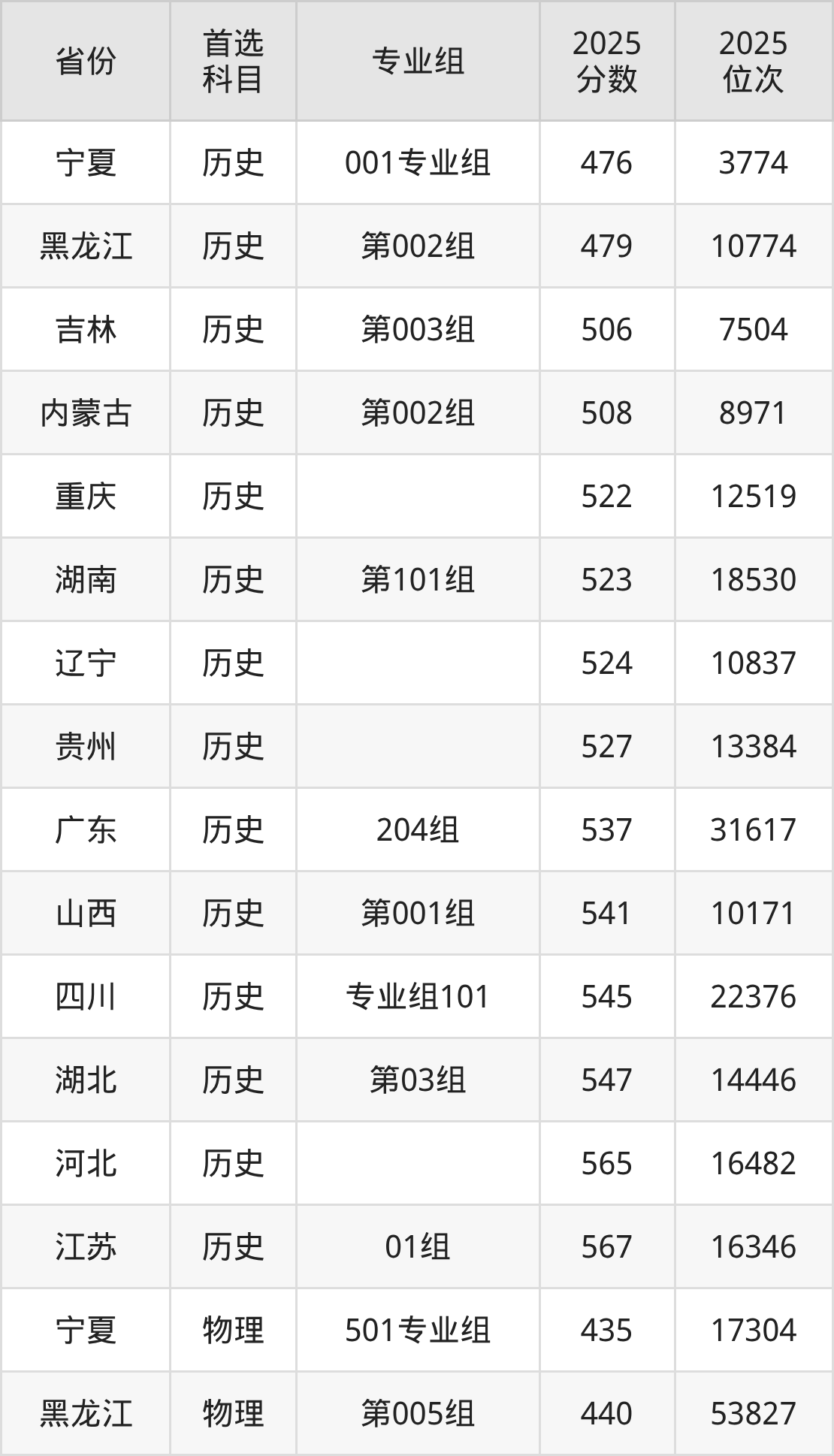历史类最低分对应地区为宁夏(001专业组),录取位次为3774,超本科B72分;最高分对应地区为江苏(01组),录取位次为16346,超本科线85分。