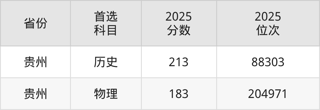 物理类最低分对应地区为贵州,录取位次为204971,超专科线3分。