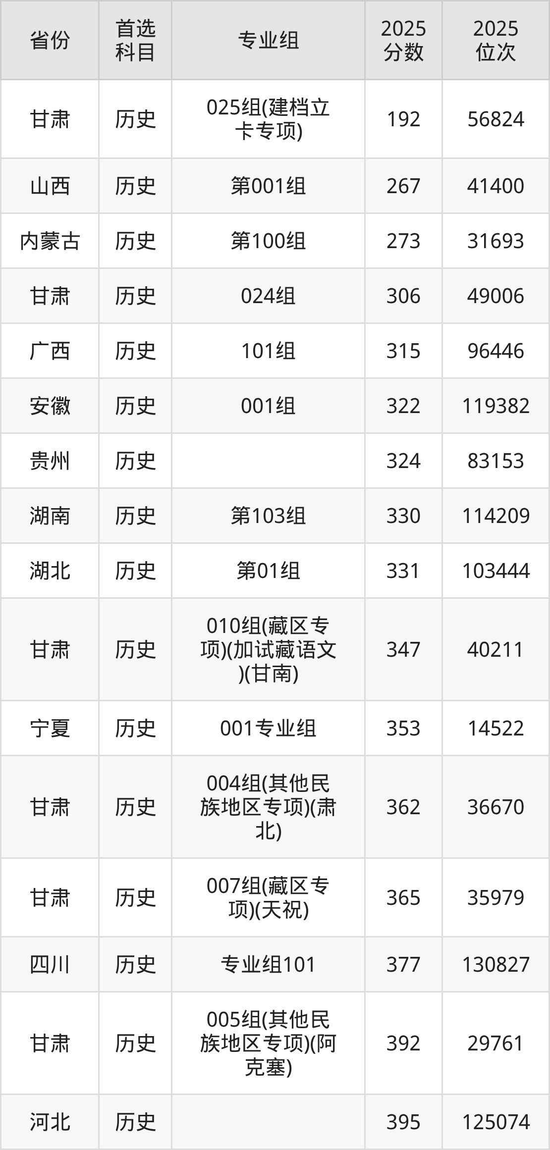 历史类:001组448分、17634名,002组(其他民族地区专项)(临夏)425分、22432名,003组(其他民族地区专项)(张家川)403分、27251名,004组(其他民族地区专项)(肃北)362分、36670名,005组(其他民族地区专项)(阿克塞)392分、29761名,006组(其他民族地区专项)(少数民族)(临夏)405分、26807名,007组(藏区专项)(天祝)365分、35979名,008组(藏区专项)(甘南)412分、25282名,010组(藏区专项)(加试藏语文)(甘南)347分、40211名,011组(藏区专项)(少数民族)(甘南)403分、27251名,024组306分、49006名,025组(建档立卡专项)192分、56824名;