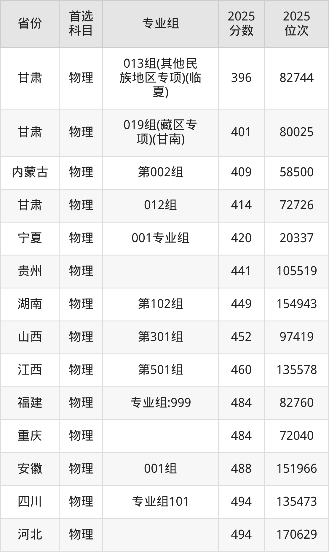 物理类最低分对应地区为山西(第302组),录取位次为60868,超专科线109分;最高分对应地区为河北,录取位次为170629,超本科线35分。