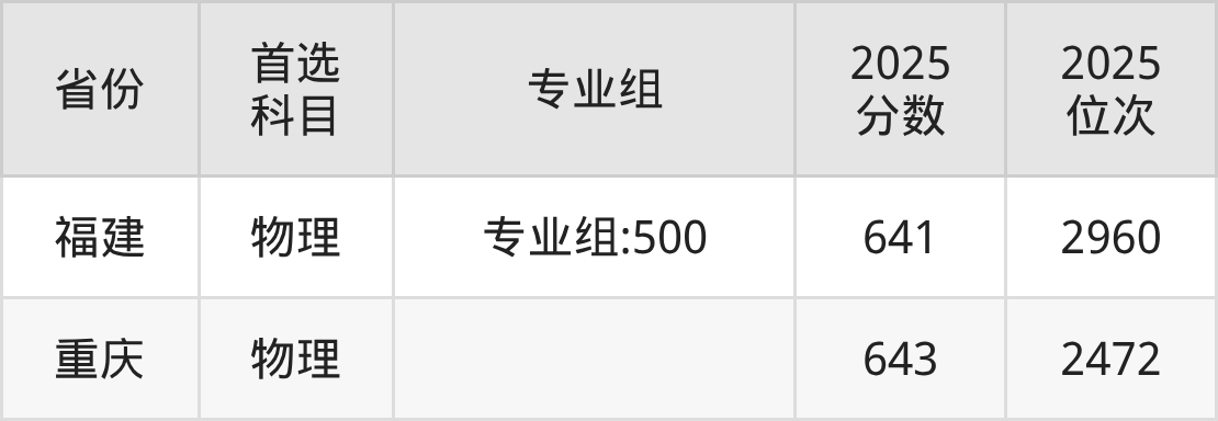 物理类最低分对应地区为福建(专业组:500),录取位次为2960;最高分对应地区为重庆,录取位次为2472,超本科线218分。