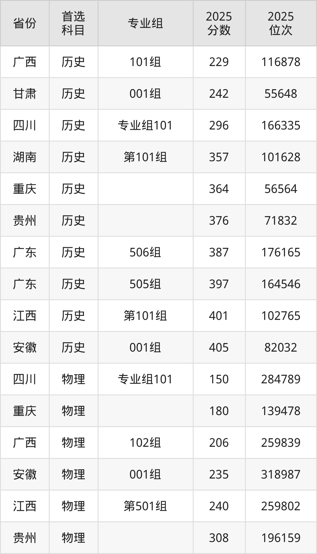 历史类最低分对应地区为广西(101组),录取位次为116878,超专科线29分;最高分对应地区为安徽(001组),录取位次为82032,超专科线205分。