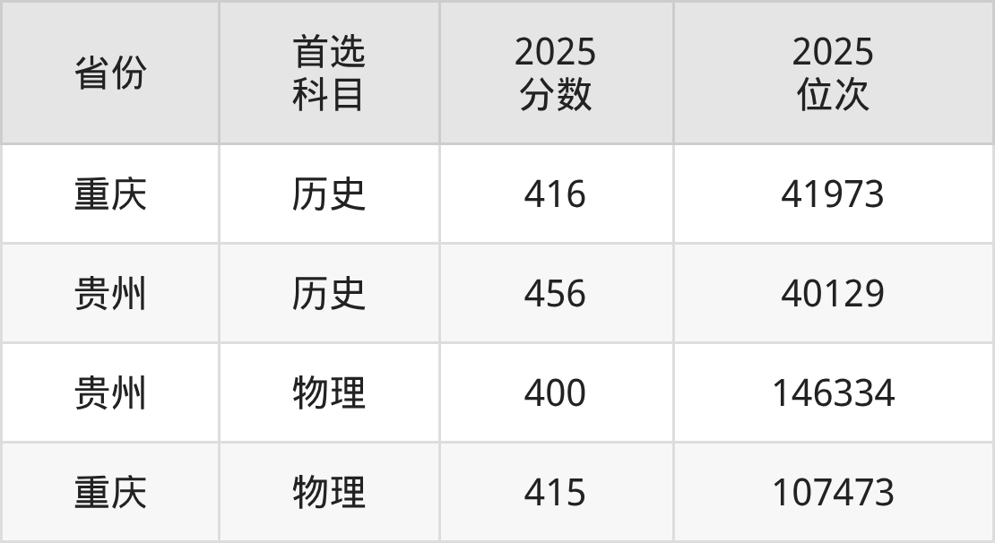 历史类最低分对应地区为重庆,录取位次为41973,超专科线236分;最高分对应地区为贵州,录取位次为40129,超专科线276分。