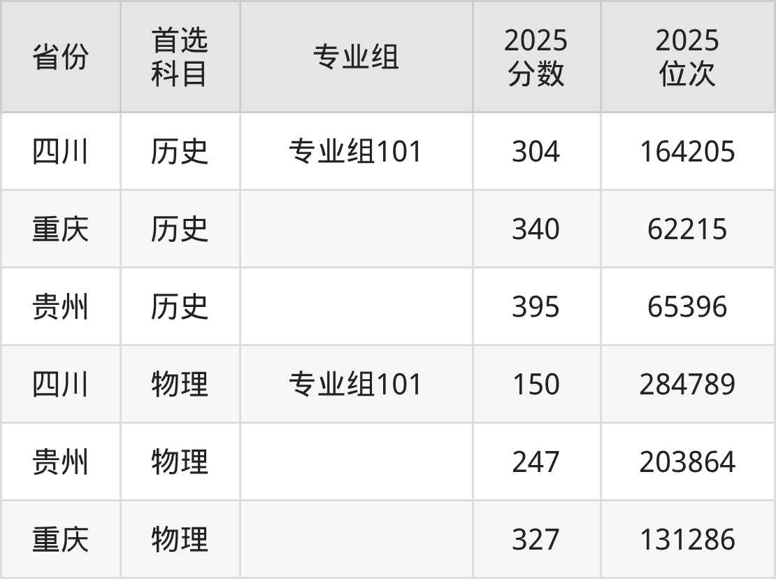 物理类最低分对应地区为四川(专业组101),录取位次为284789;最高分对应地区为重庆,录取位次为131286,超专科线147分。