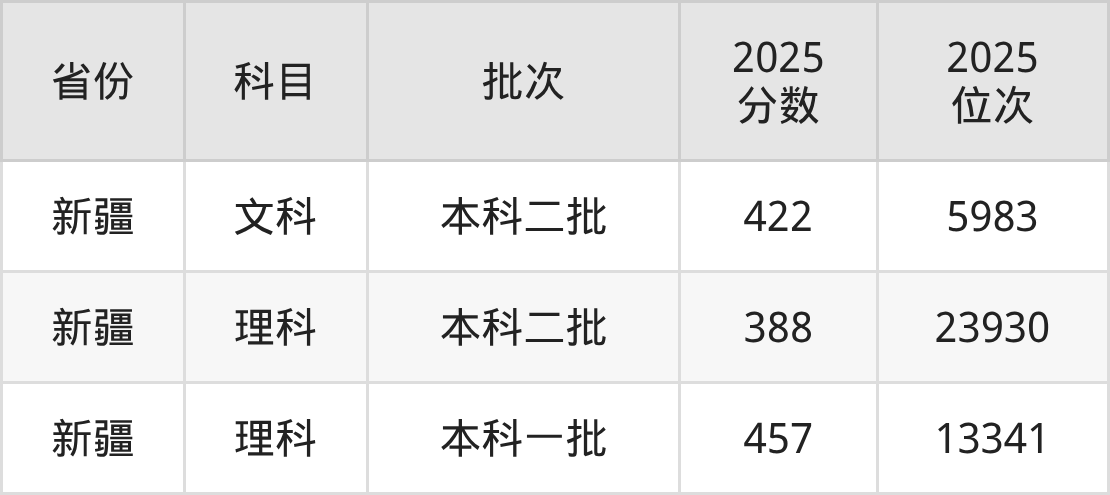 文科最低分对应地区为新疆,录取位次为5983,超二本线92分。