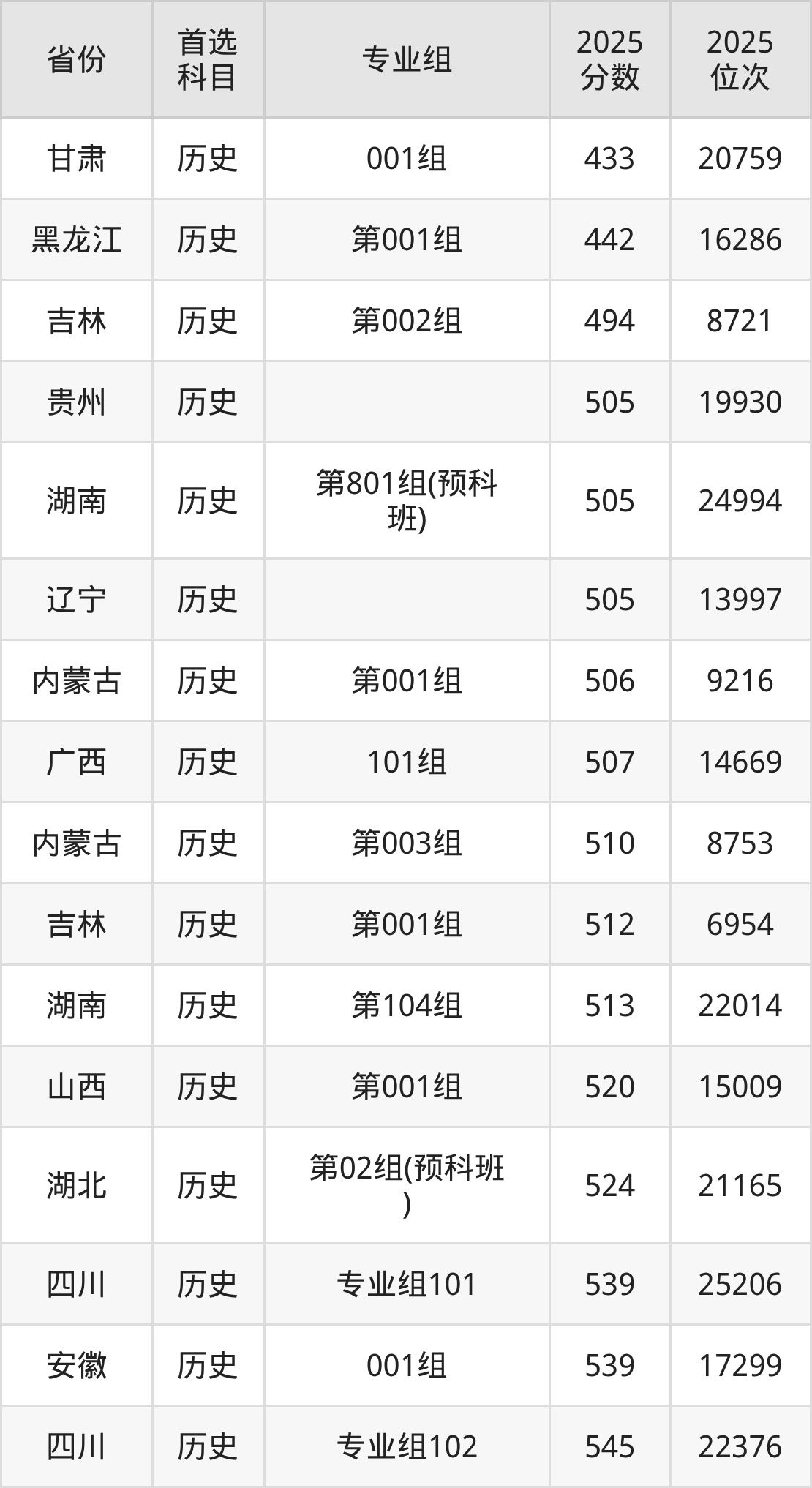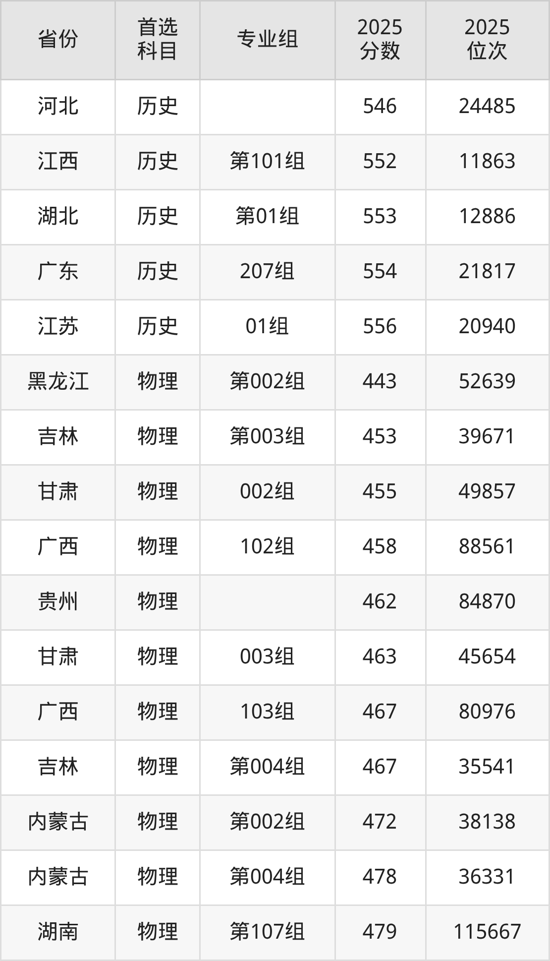 历史类最低分对应地区为甘肃(001组),录取位次为20759,超本科线21分;最高分对应地区为江苏(01组),录取位次为20940,超本科线74分。