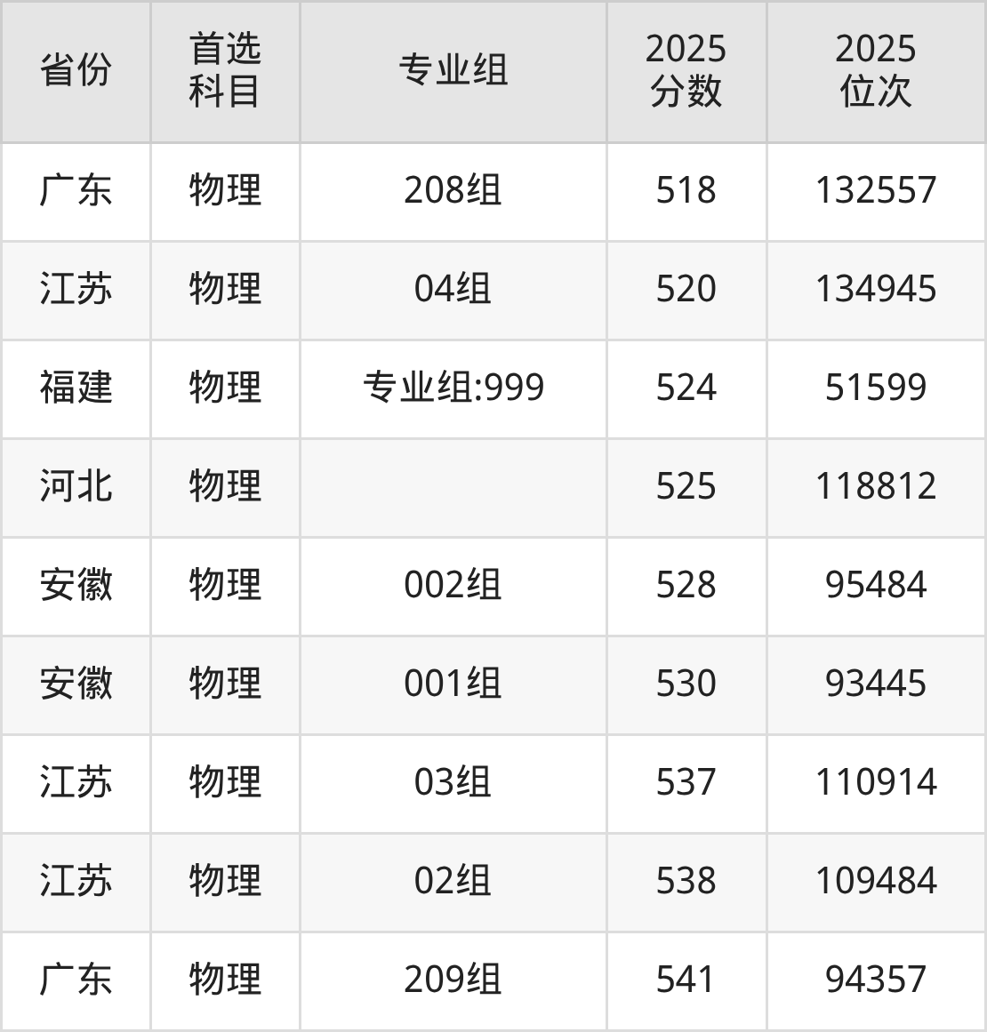 物理类最低分对应地区为黑龙江(第002组),录取位次为52639,超本科线83分;最高分对应地区为广东(209组),录取位次为94357,超本科线105分。