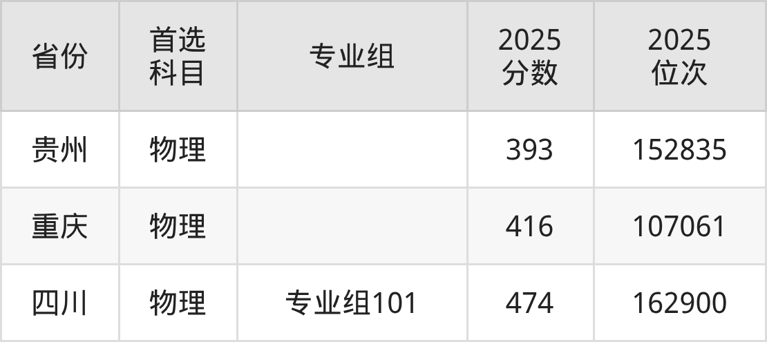 物理类最低分对应地区为贵州,录取位次为152835,超专科线213分;最高分对应地区为四川(专业组101),录取位次为162900,超专科线324分。