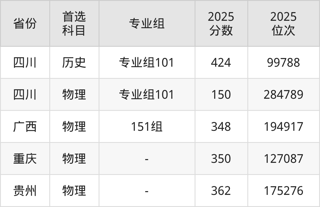 物理类最低分对应地区为四川(专业组101),录取位次为284789;最高分对应地区为贵州,录取位次为175276,超专科线182分。