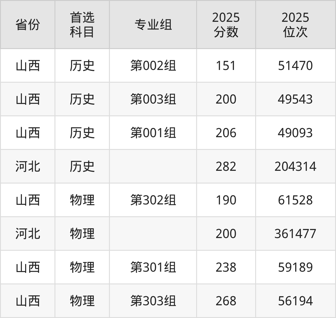 物理类最低分对应地区为山西(第302组),录取位次为61528;最高分对应地区为山西(第303组),录取位次为56194,超专科线168分。