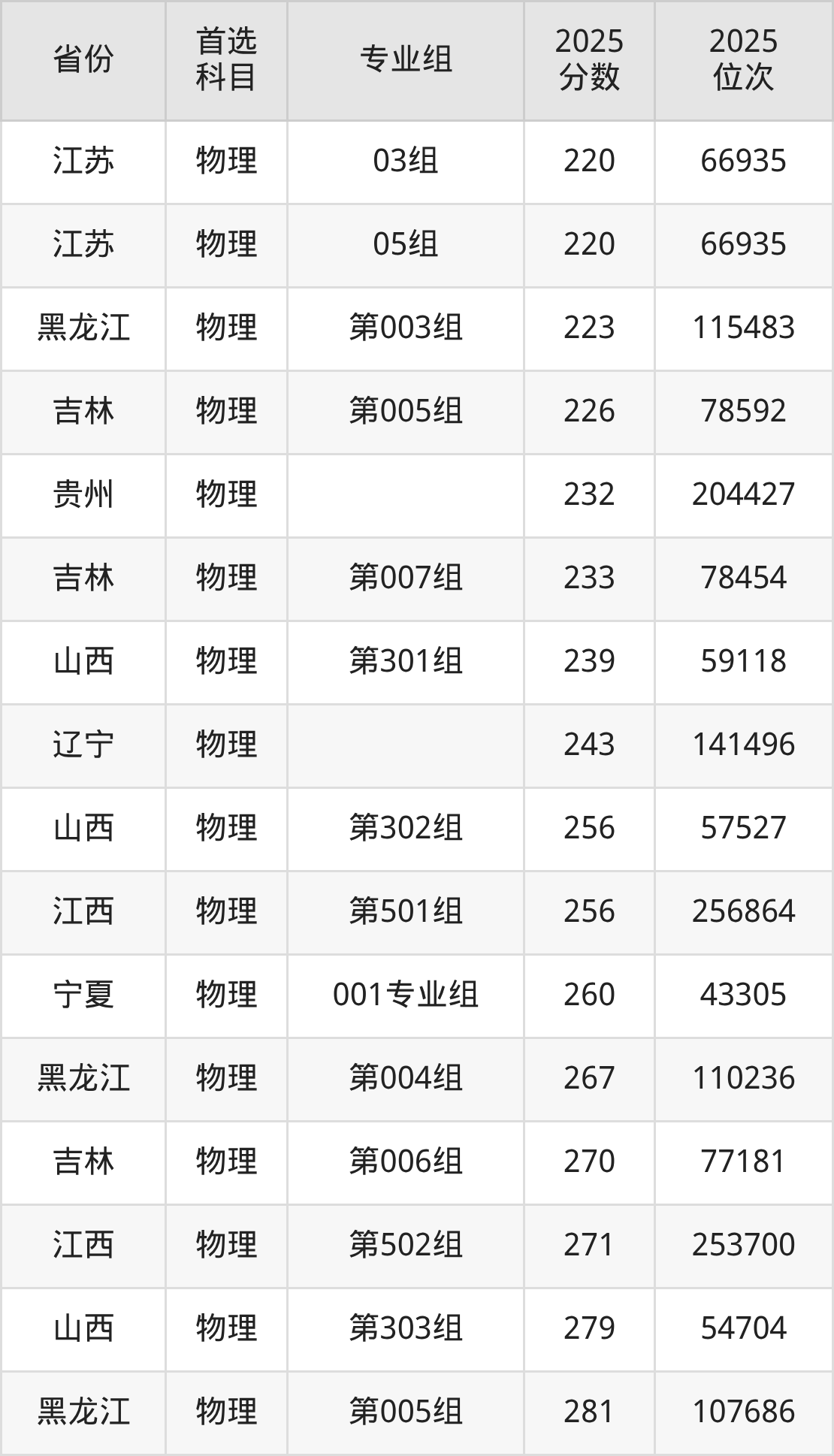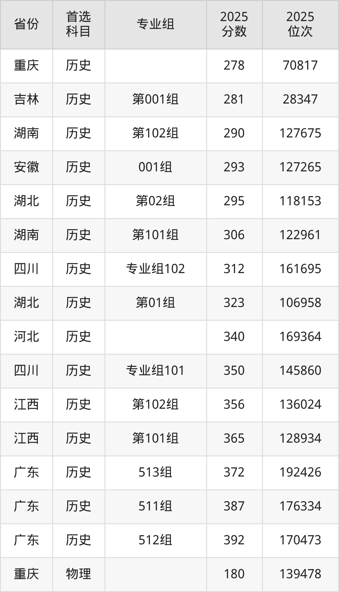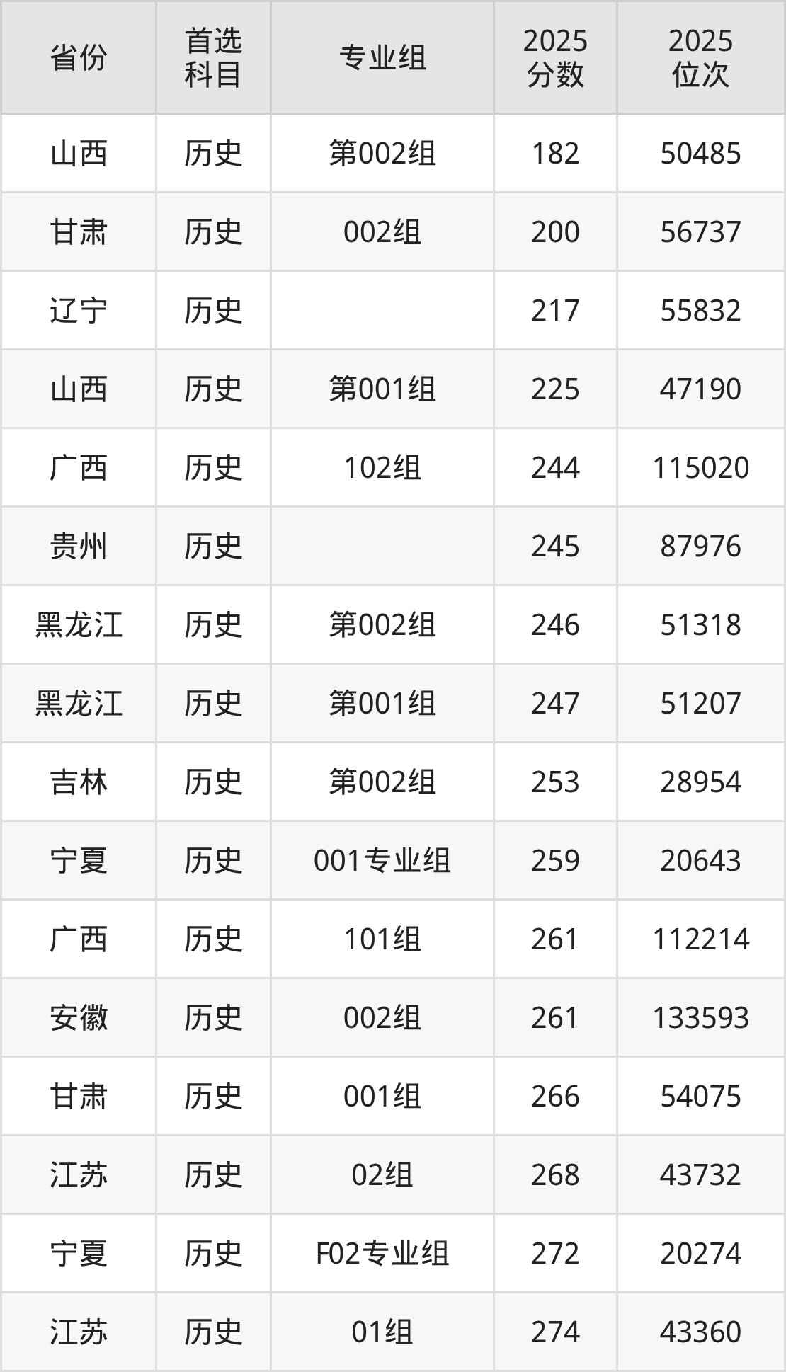 历史类最低分对应地区为山西(第002组),录取位次为50485,超专科线82分;最高分对应地区为广东(512组),录取位次为170473,超专科线177分。