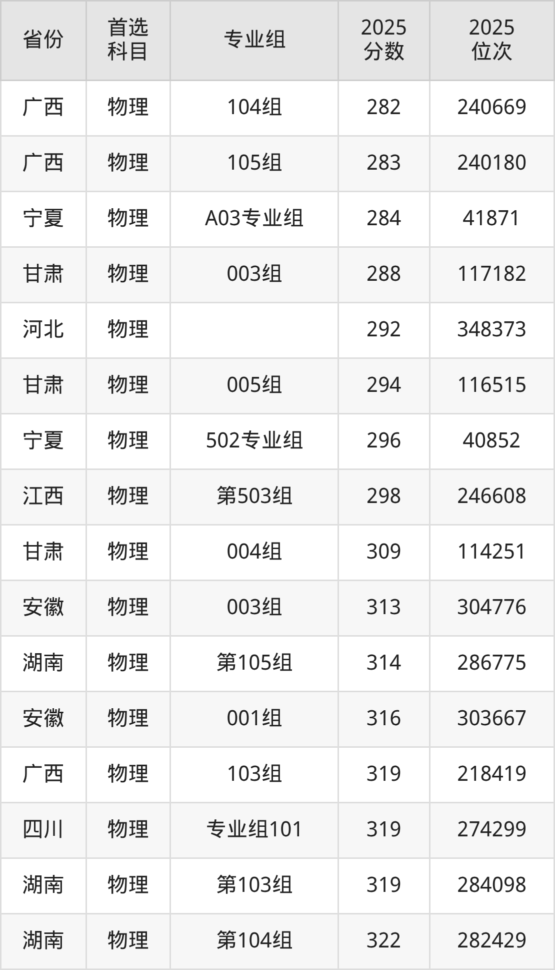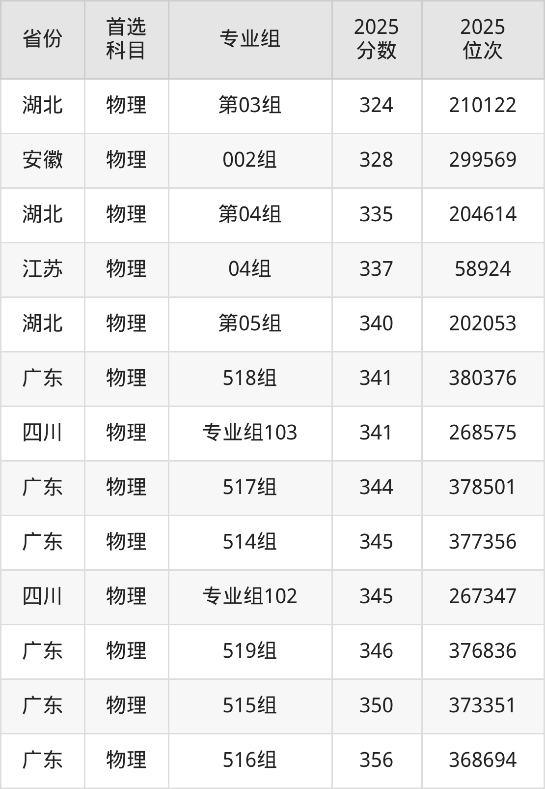 物理类最低分对应地区为重庆,录取位次为139478;最高分对应地区为广东(516组),录取位次为368694,超专科线156分。