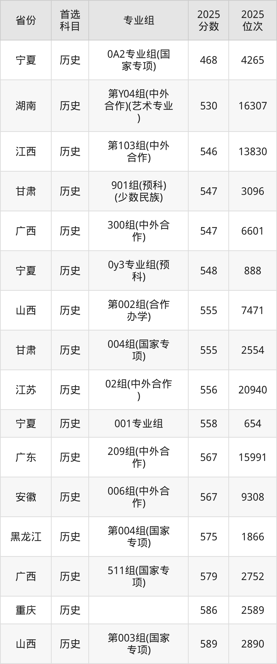 历史类:第05组592分、2821名,第06组614分、1147名,第07组605分、1702名,第08组(国家专项)593分、2701名,第09组(预科班)592分、2821名;